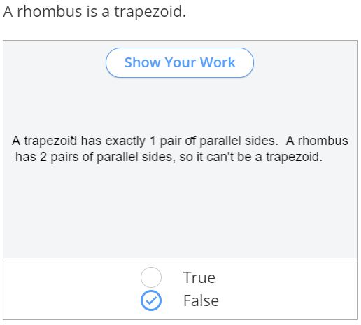 Here are some statements about rhombuses. Select TRUE or FALSE. Then, in the "show your work" box, select the T to type a sentence to explain your answer. See the example below!