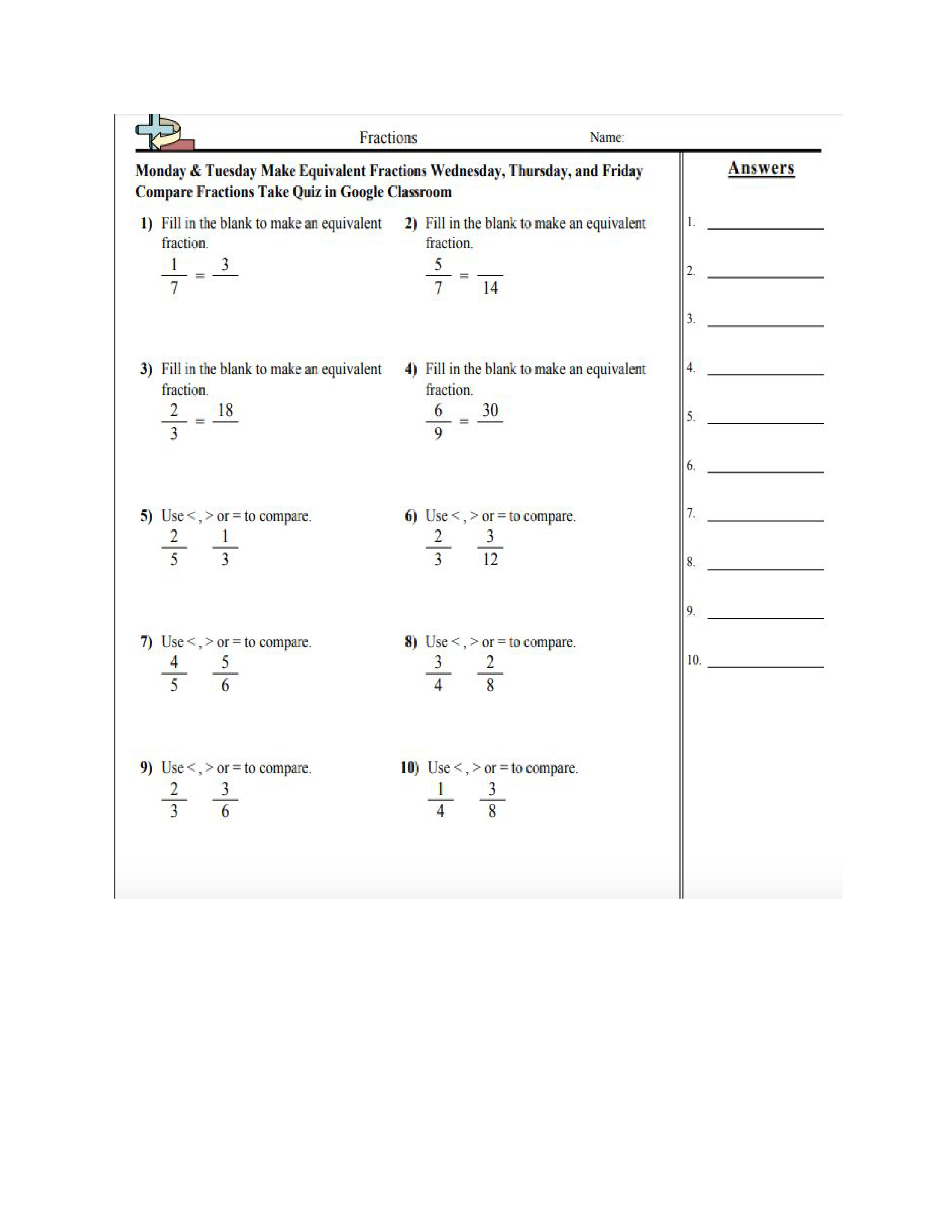 Fractions April 13-17 Quiz (Only fill in the missing number. Don't write the fraction.) Acquarelli
