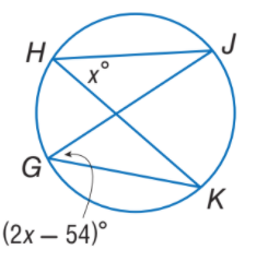 Quadrilateral FGHJ is inscribed in circle O; m∠HJF = 84.