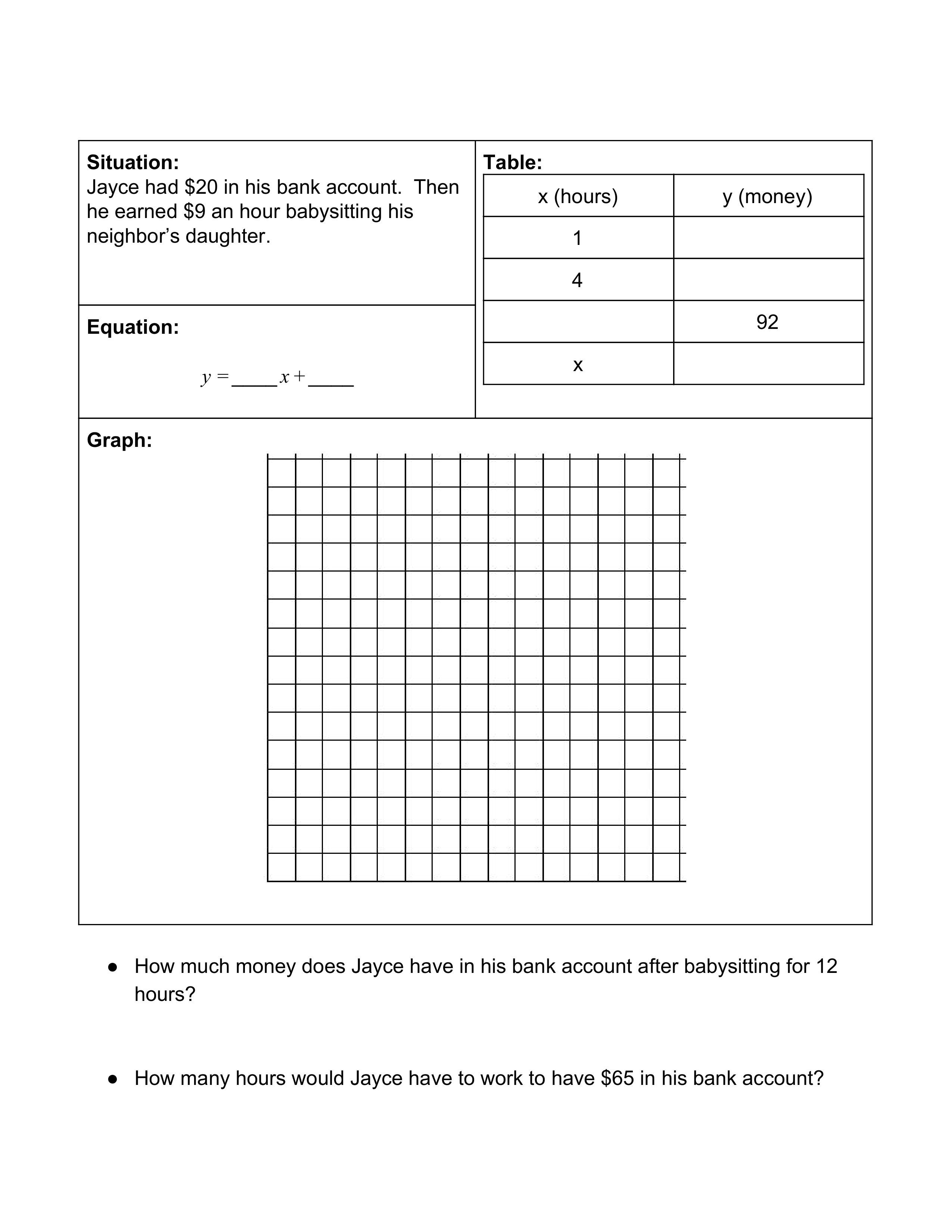 Students complete multiple representations (table, graph, equation) for a real world situation.