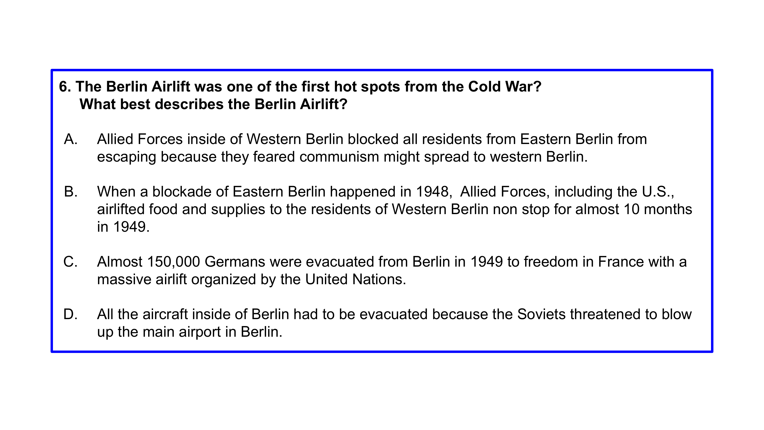 The Berlin Airlift was one of the first hot spots from the Cold War?What best describes the Berlin Airlift?