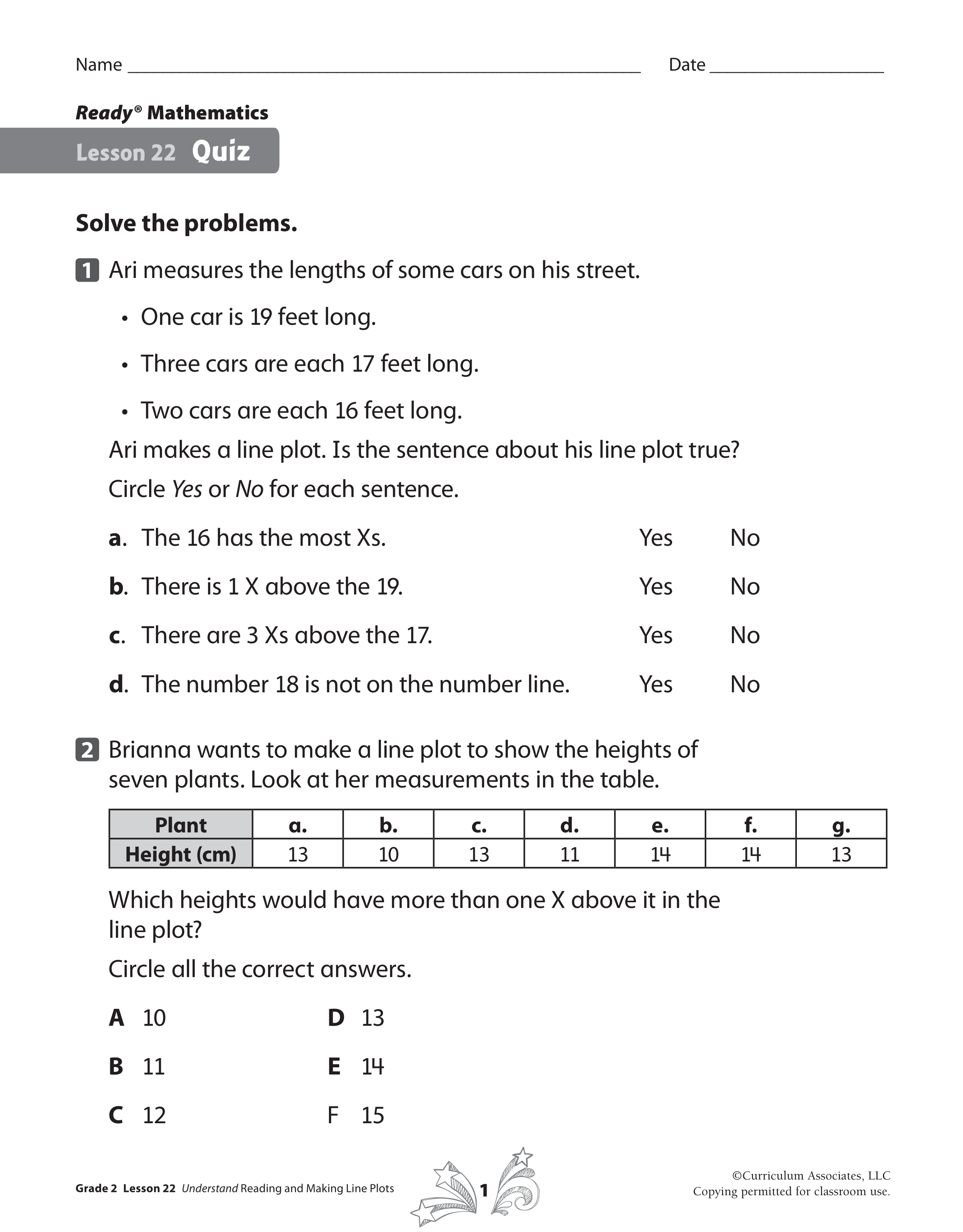 Ari measures the lengths of some cars on his street.One car is 19 feet long.Two cars are 17 feet long.Two cars are each 16 feet long.Ari makes a line plot. Is the sentence about his line plot true?Circle Yes or No for each sentence.