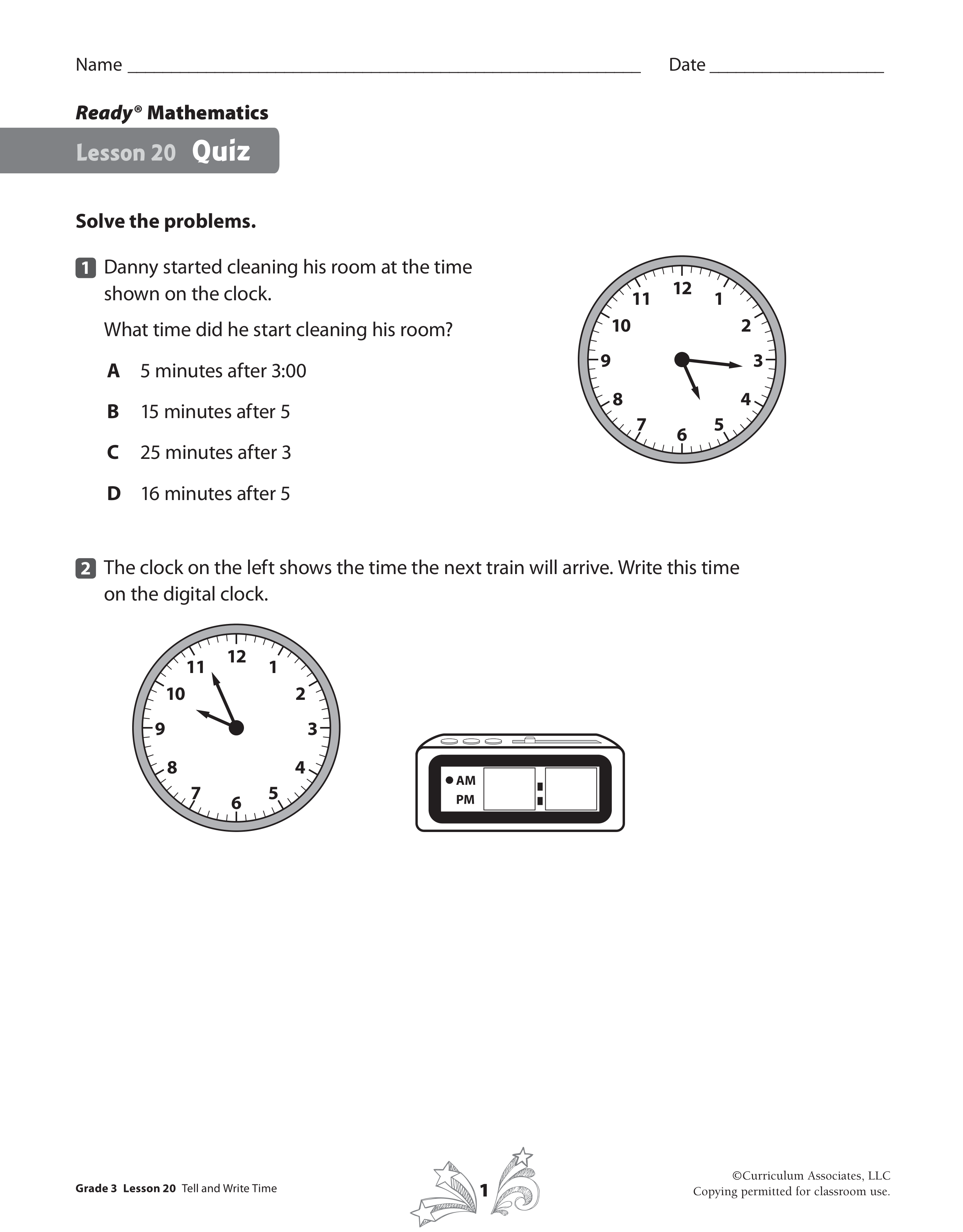 Danny started cleaning his room at the time shown on the clock.