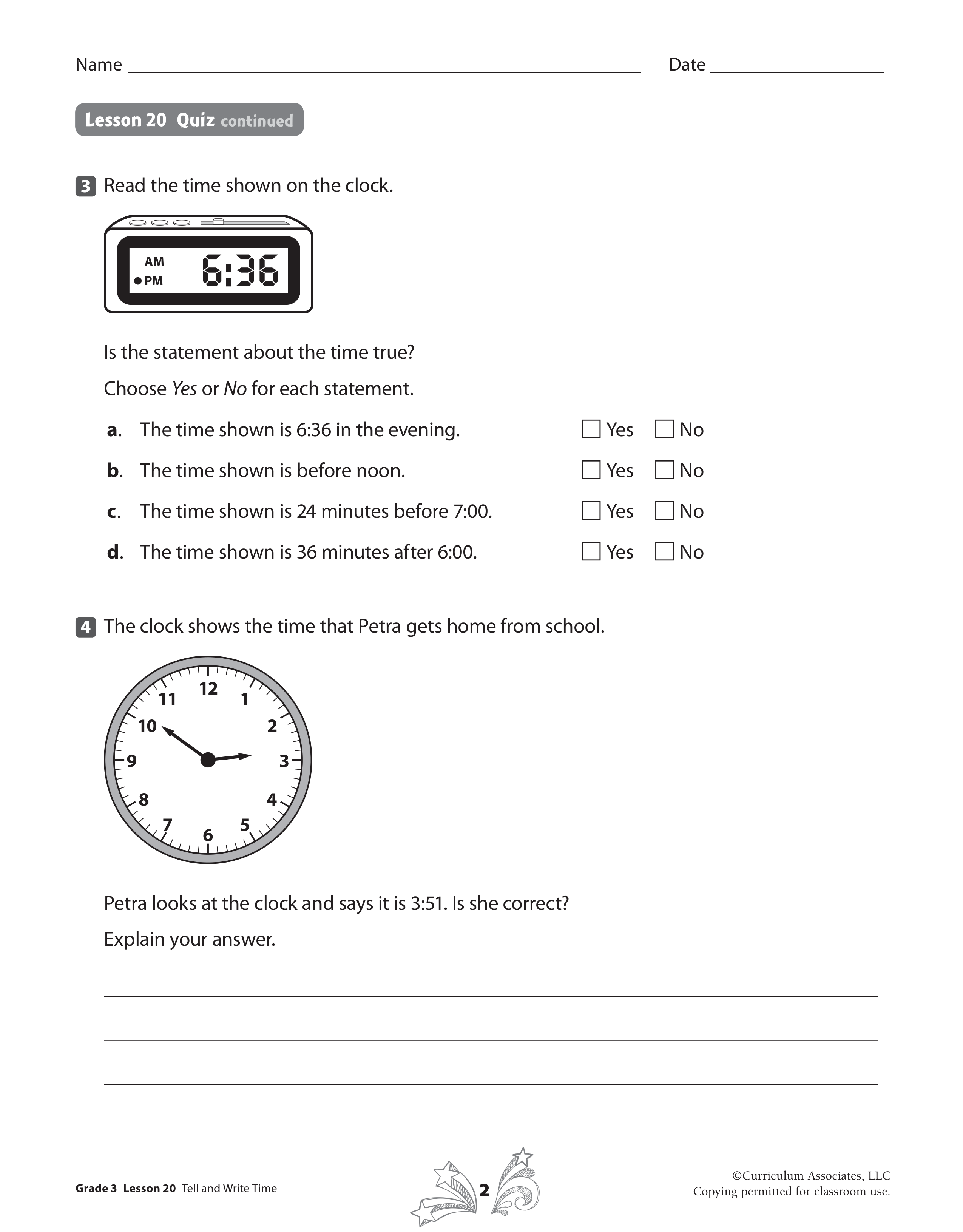 Petra looks at the clock and says it is 3:51. Is she correct? Explain your answer.
