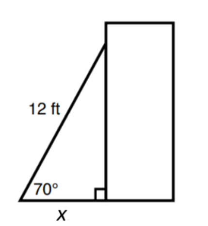 6) A 12-foot ladder touches a building and makes a 70° angle with the ground. How far from the building is the base of the ladder?