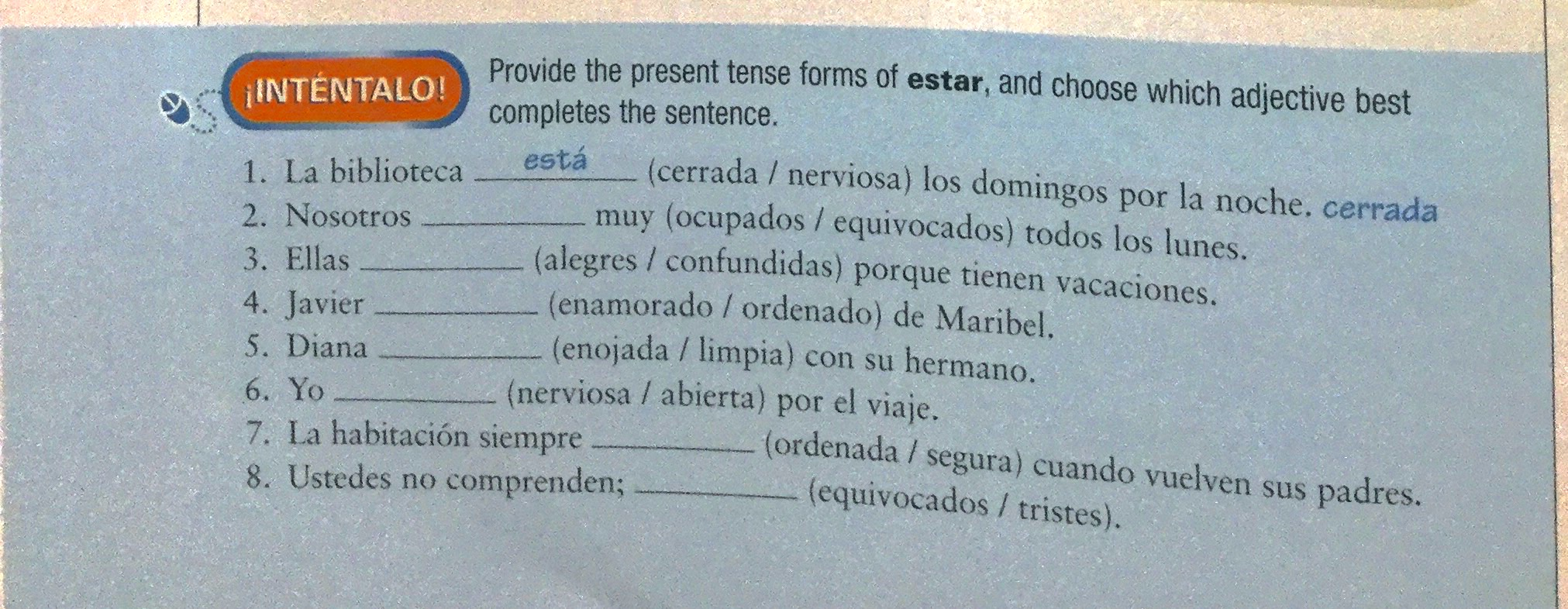 Type the form of estar that fills in the blank AND type the correct adjective in parenthesis. This is number 1. It is done for you in the picture. Skip this one. I just want the numbers to match up. :)type "está cerrada"