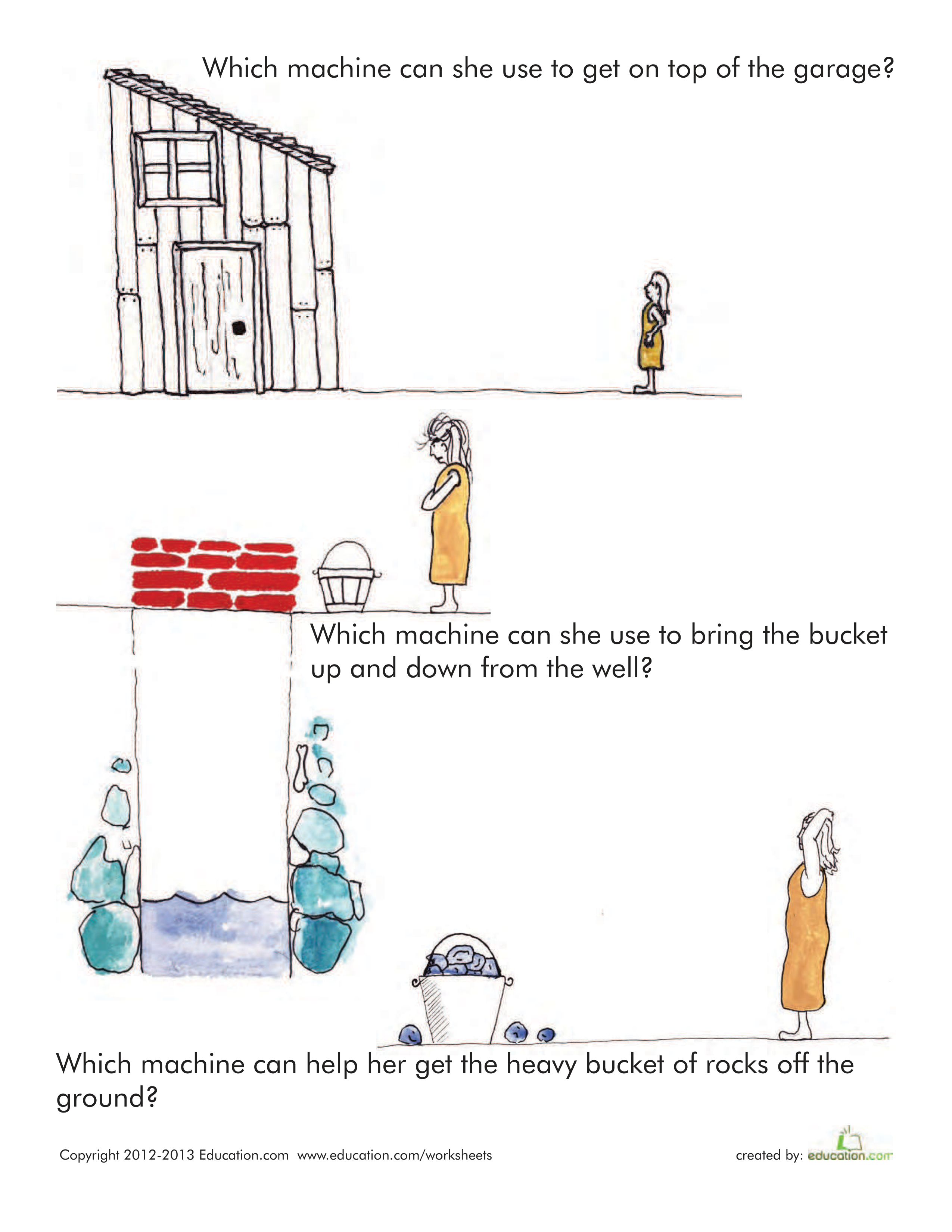 Which machine can help her get the heavy bucket of rocks off the ground?