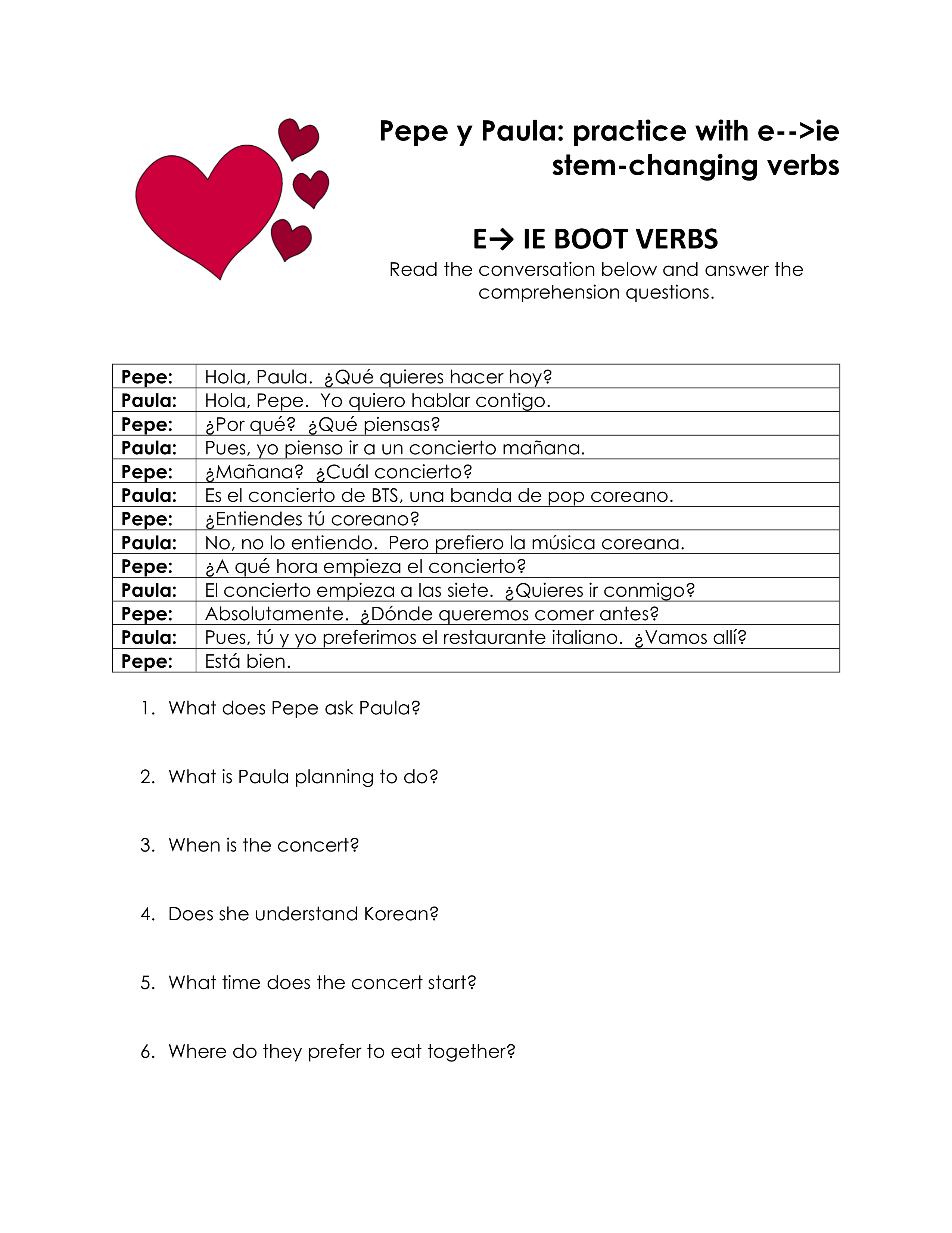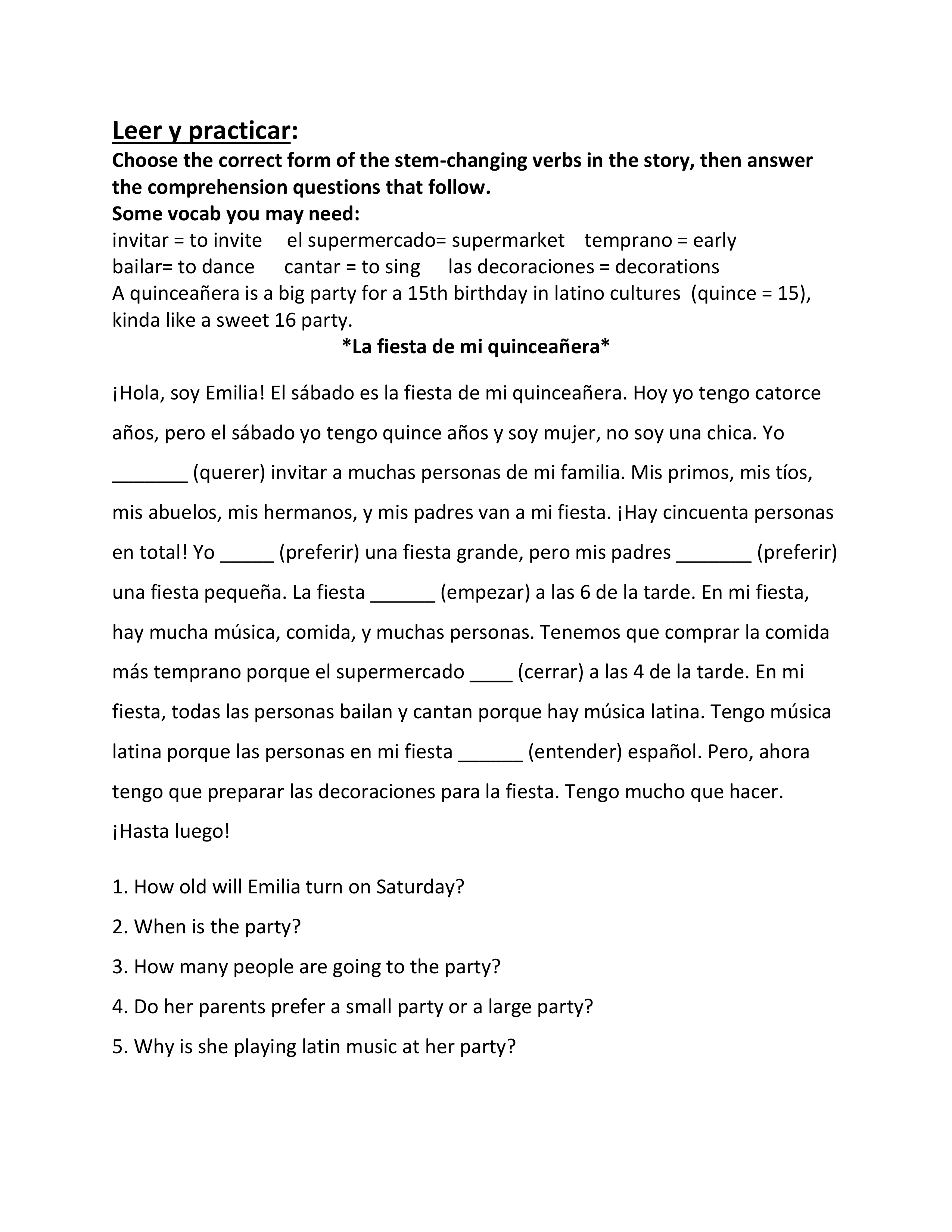 Read the conversations and answer the comprehension questions, choosing the correct form of the stem-changing verbs within the stories as needed. You can submit as many times as needed to get a perfect score. Make sure you answer all 22 questions. Get 18 or more correct for full credit. Due Friday 5/1 at 3pm. Since Q3 ends and grades are due, the last chance to turn in is Monday 5/4 at 1pm.