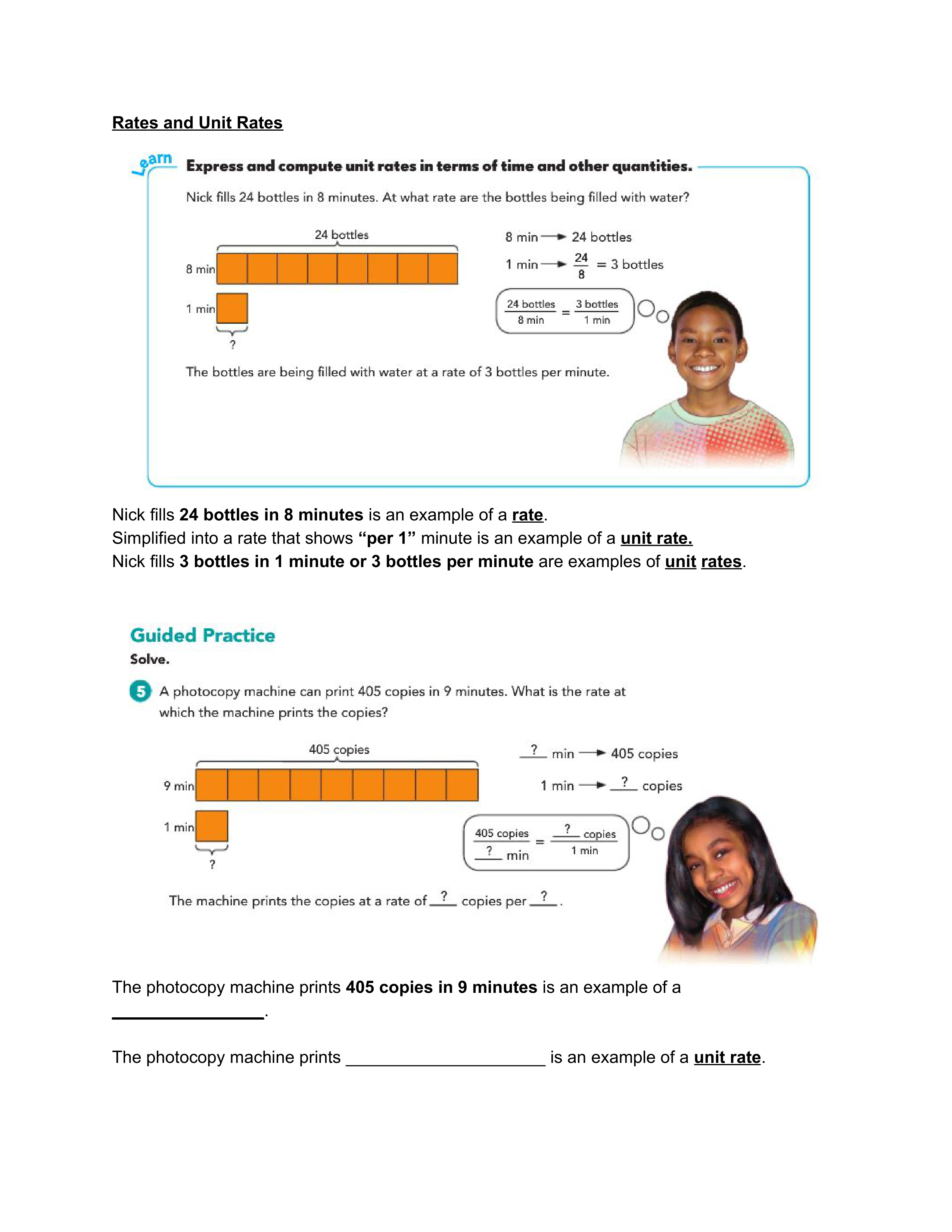 READ the "Learn" problem about Nick and the bottles of water he is filling. This is an example of a real-world situation that involves a rate and unit rate.