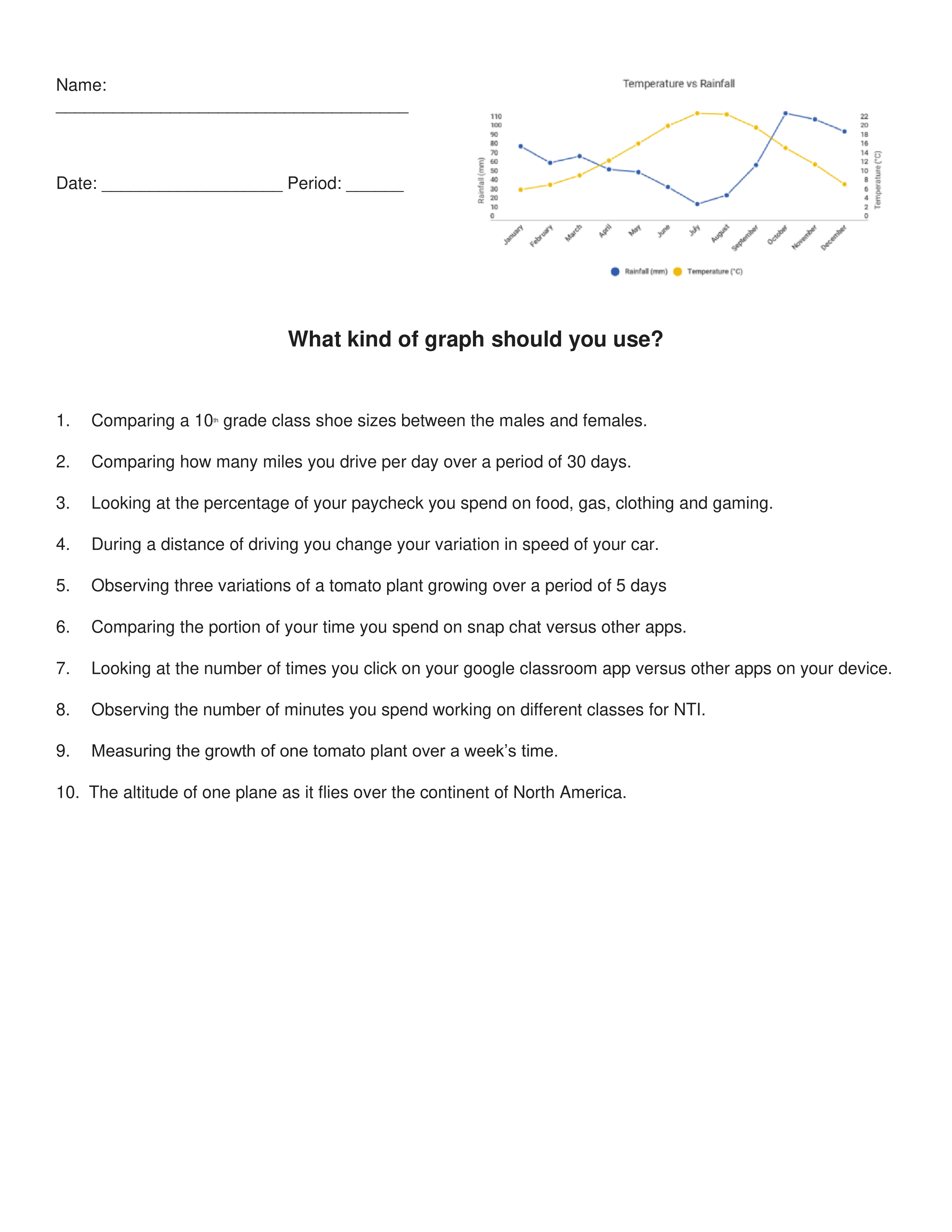 Simple worksheet on what kind of graph you should use in different scenarios when collecting data