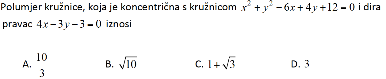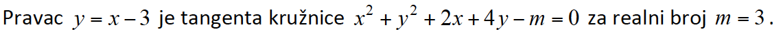 Paralelni pravci y = 3x − 2 i y = 3x +1 su tangente kružnice. Ako je središte te kružnice