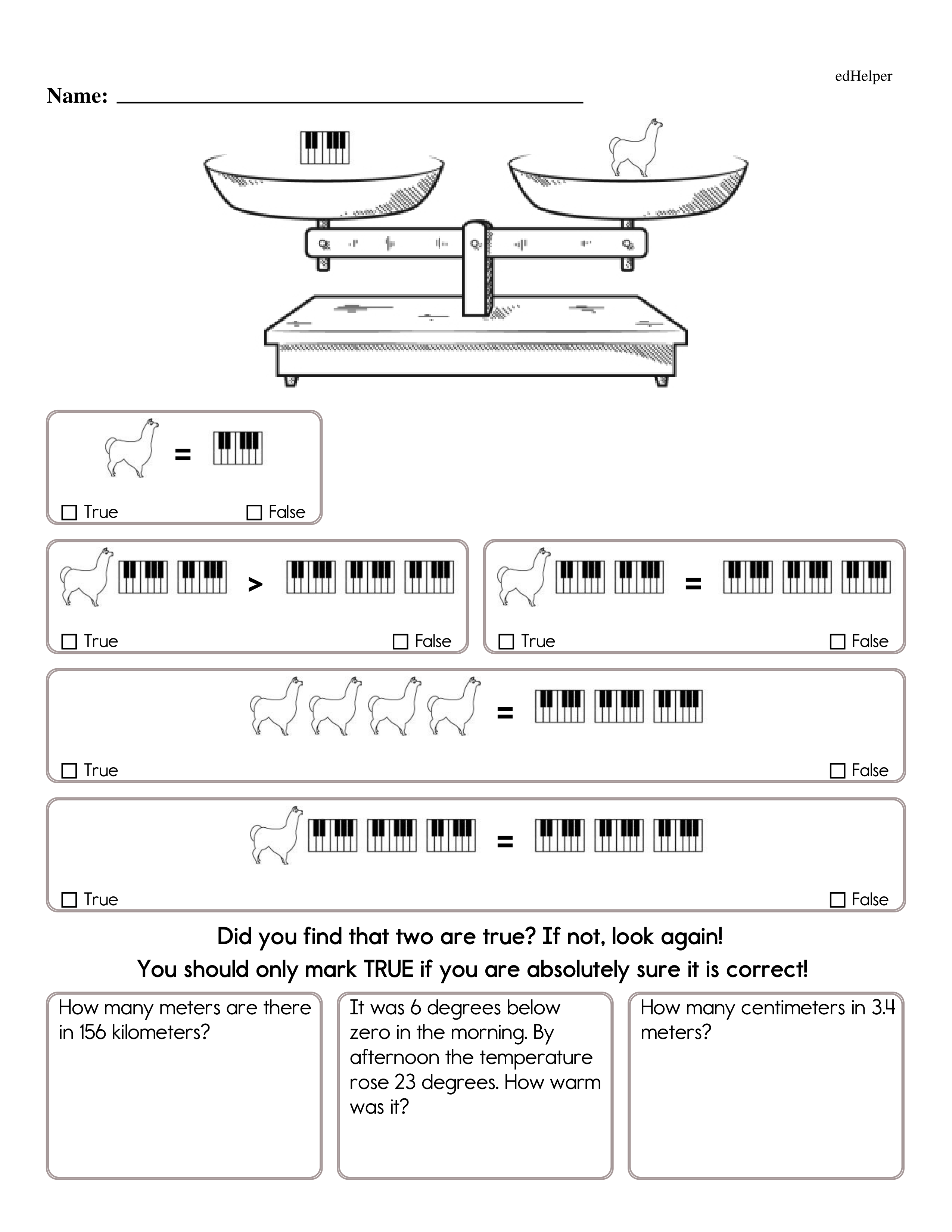 Use the large picture at the top of the page to help you anwser the true/false questions. Place an "X" in the box to show your answer. Then, solve the 3 questions at the bottom of the page.