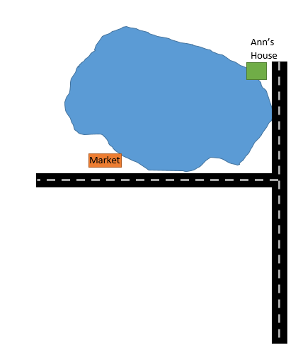 Ann lives on the shoreline of a large lake. A market is located 24 km south and 32 km west of her home on the other side of the lake. If she takes a boat across the lake directly toward the market, how far is her home from the market?