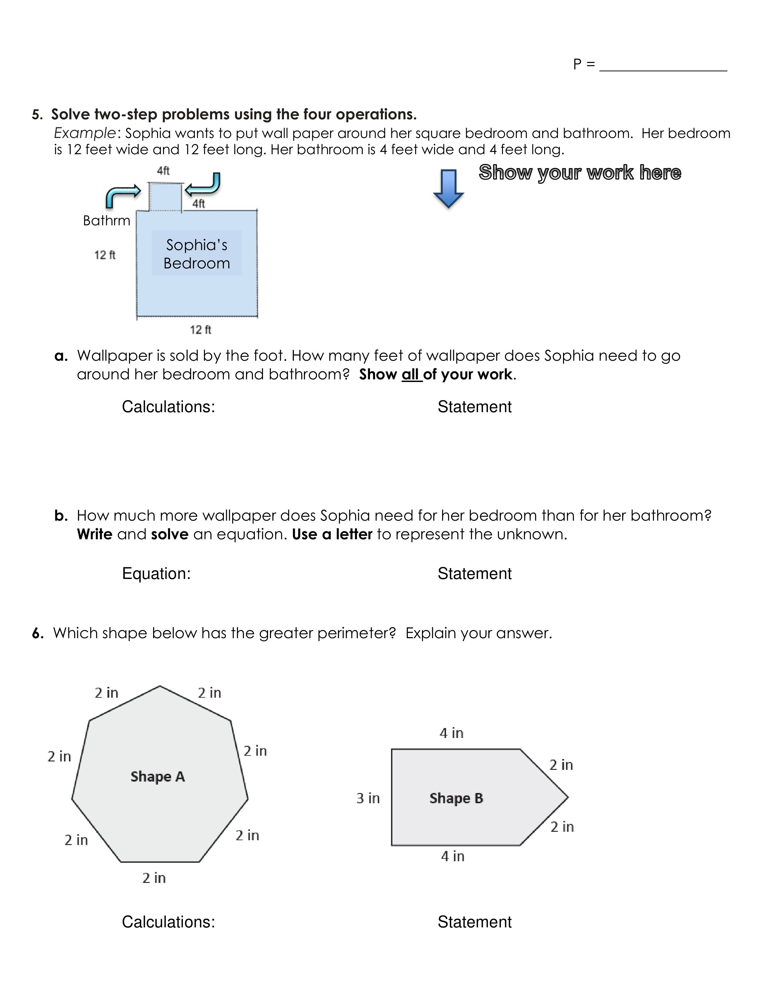 Show calculations for BOTH shapes, which will show which one has the greater perimeter. Also include the statement with your decision/answer.