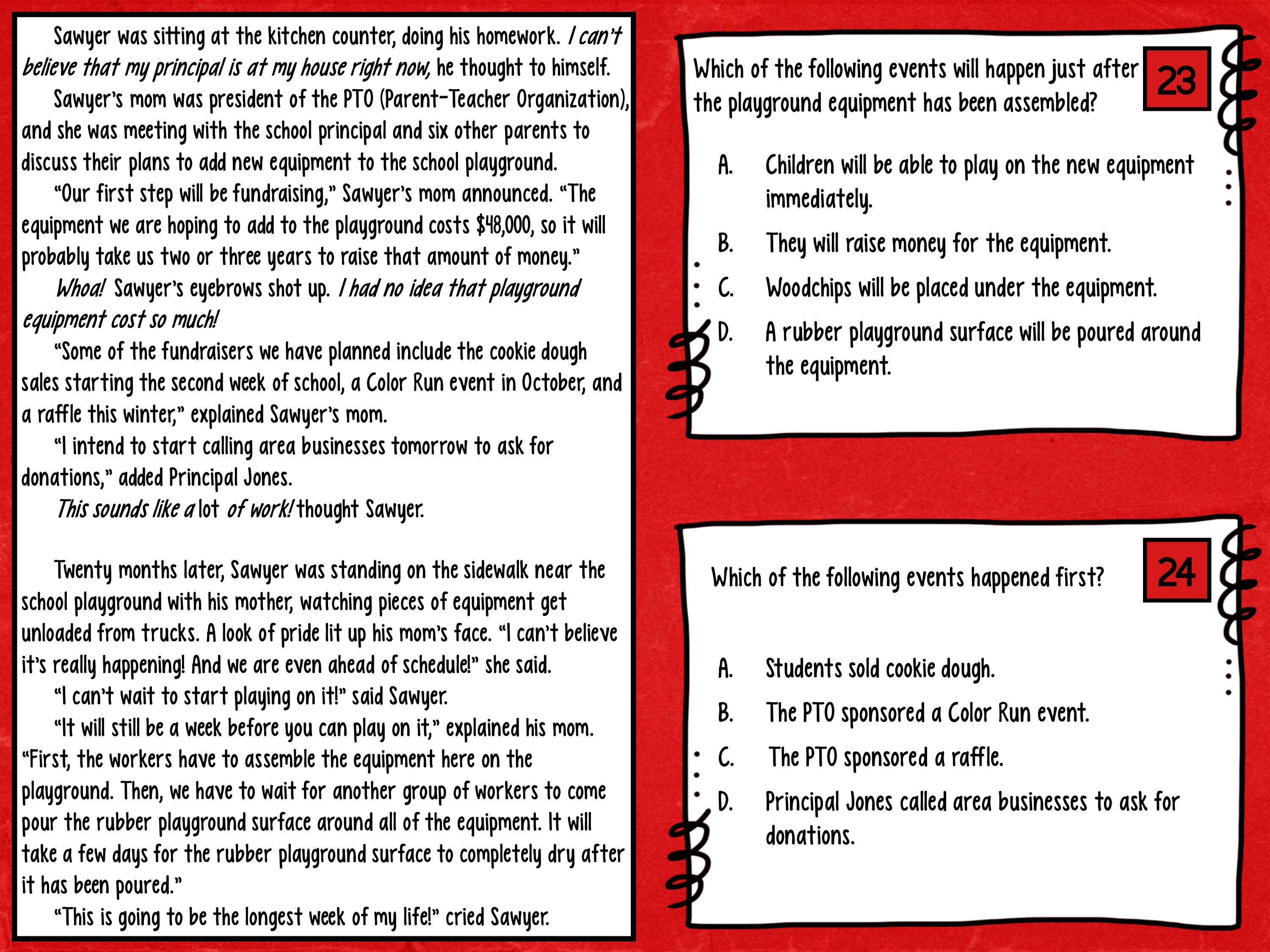 Which of the following events happend first?A. Students sold cookie dough.B. The PTO sponsored a Color Run event.C. The PTO sponsored a raffle.D. Principal Jones called area business to ask for donations.