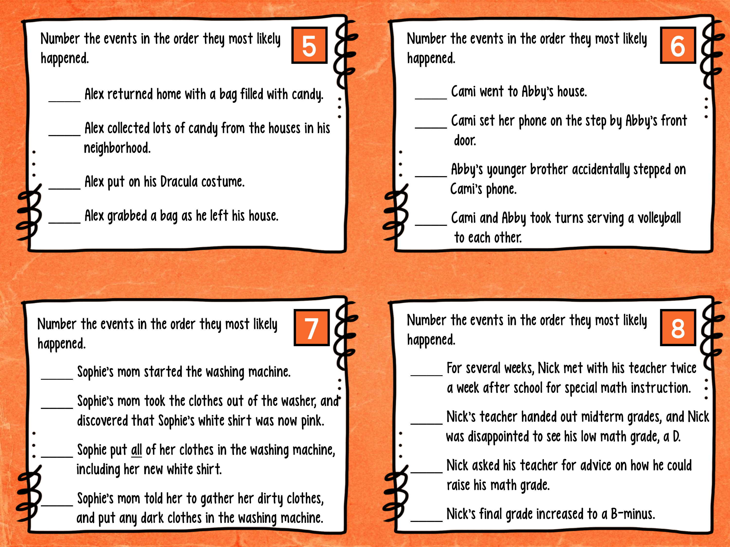 Number the events in the order they most likely happened._____ For several weeks, Nick met with his teacher twice a week after school for special math instruction.______ Nick's teacher handed out midterm grades, and Nick was disappointed to see his low math grade, a D.______ Nick asked his teacher for advice on how he could raise his math grade.______ Nick's final grade increased to a B-minus.