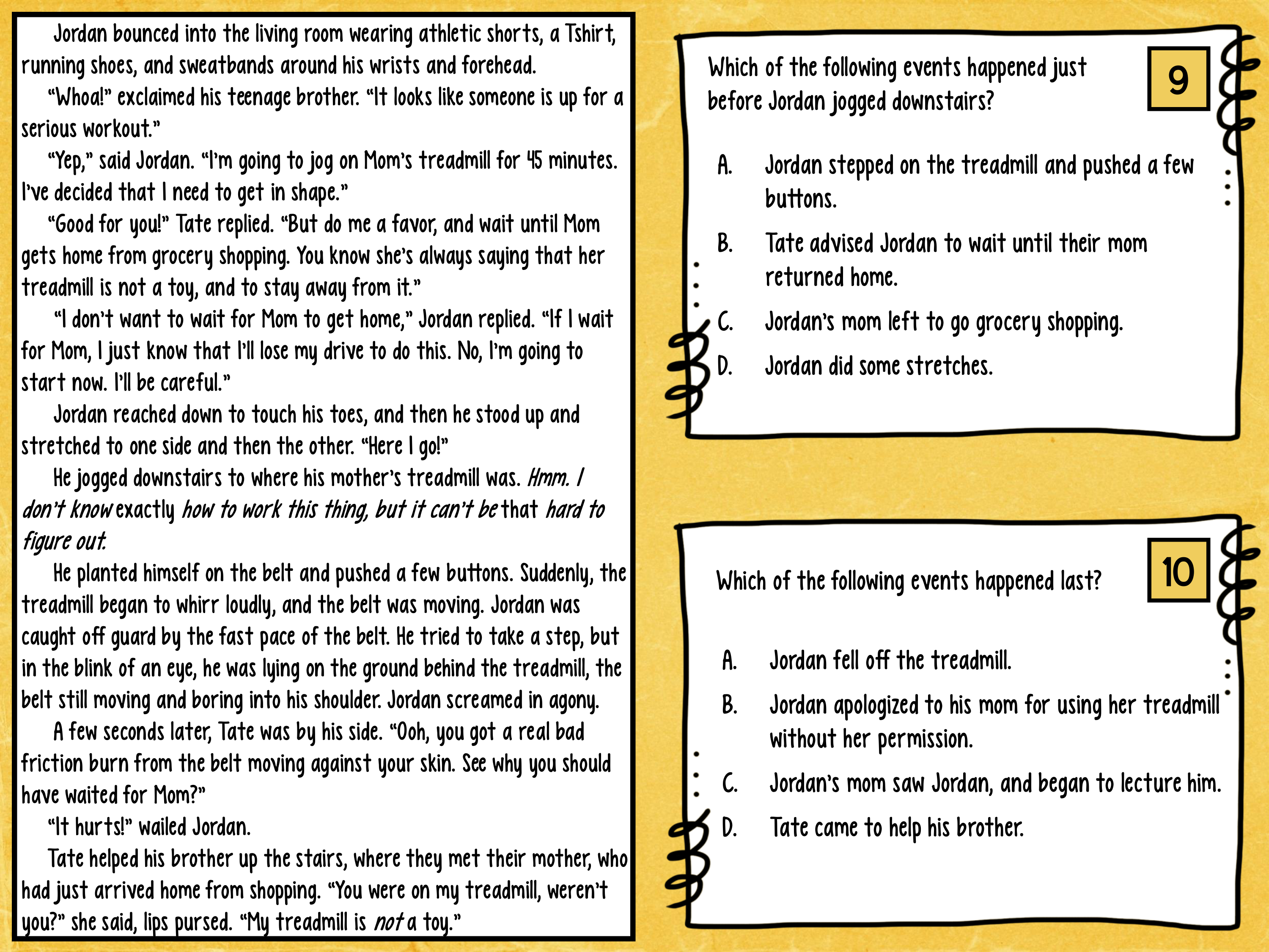 Which of the following events happended just before Jordan jogged downstairs?A. Jordan stepped on the treadmill and pushed a few buttons.B. Tate advised Jordan to wait untile their mom returned home.C. Jordan's mom left to go grocery shopping.D. Jordan did some stretches.