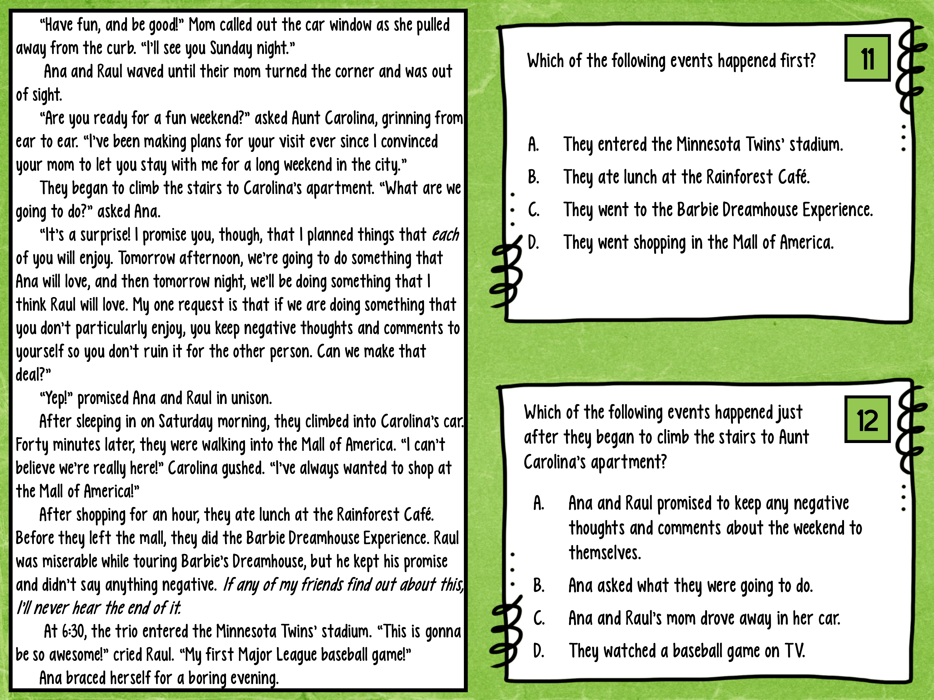 Which of the following events happended just after they began to climb the stairs to Aunt Carolina's apartment?A. Ana and Raul promised to keep any negative thoughts and comments about the weekend to themselves.B. Ana asked what they were going to do.C. Ana and Raul's mom drove away in her car.D. They watched a baseball game on TV.