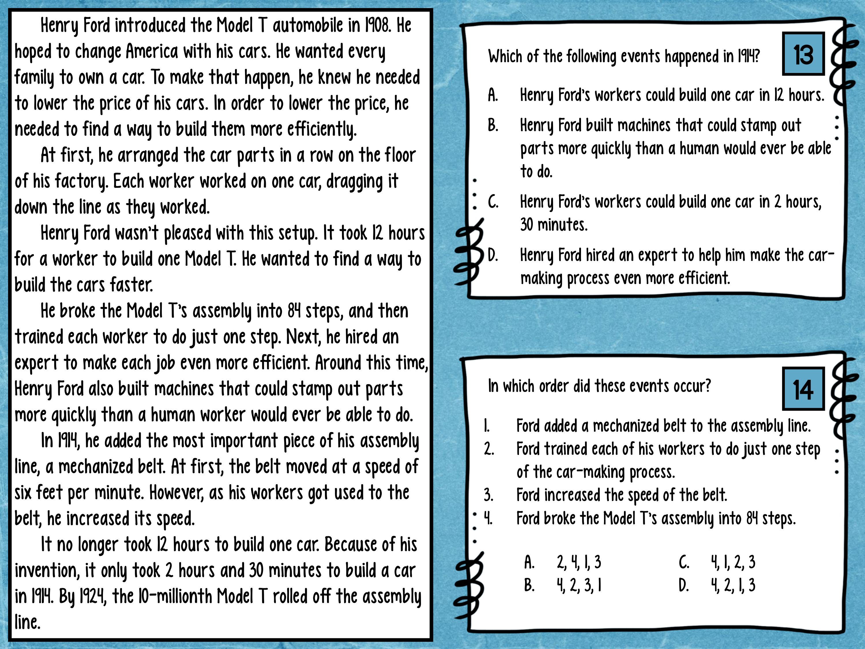 Which of the following events happended in 1914?A. Henry Ford's workers could build one car in 12 hours.B. Henry Ford built machines that could stamp out parts more quickly than a human would ever be able to do.C. Henry Ford's workers could build one car in 2 hours, 30 minutes.D. Henry Ford hired an expert to help him made the car-making process even more efficient.