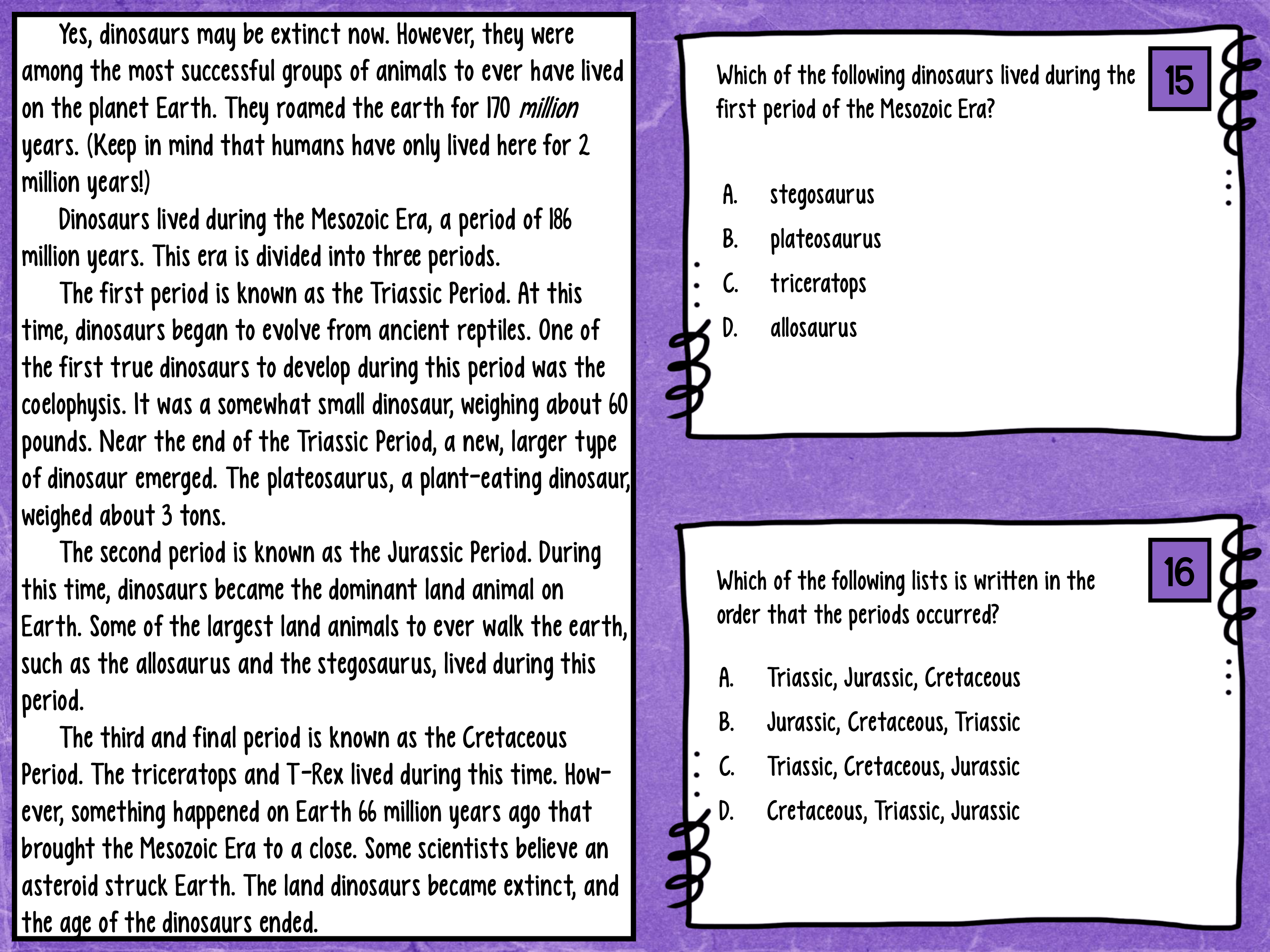 Which of the following lists is written in the order that the periods occured?A. Triassic, Jurassic, CretaceousB. Jurassic, Creataceous, TriassicC. Triassic, Cretaceous, JurassicD. Creataceous, Triassic, Jurassic