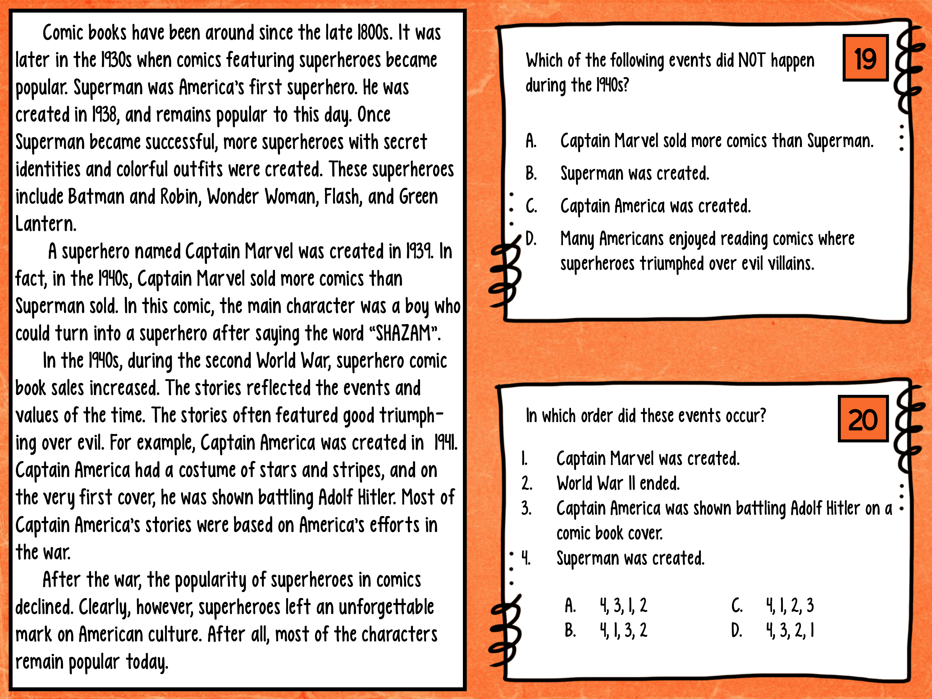 Which of the following events did NOT happen during the 1940s?A. Captain Marvel sold more comics than Superman.B. Superman was created.C. Captain American was created.D. Many Americans enjoyed reading comics where superheroes trimphed over evil villains.