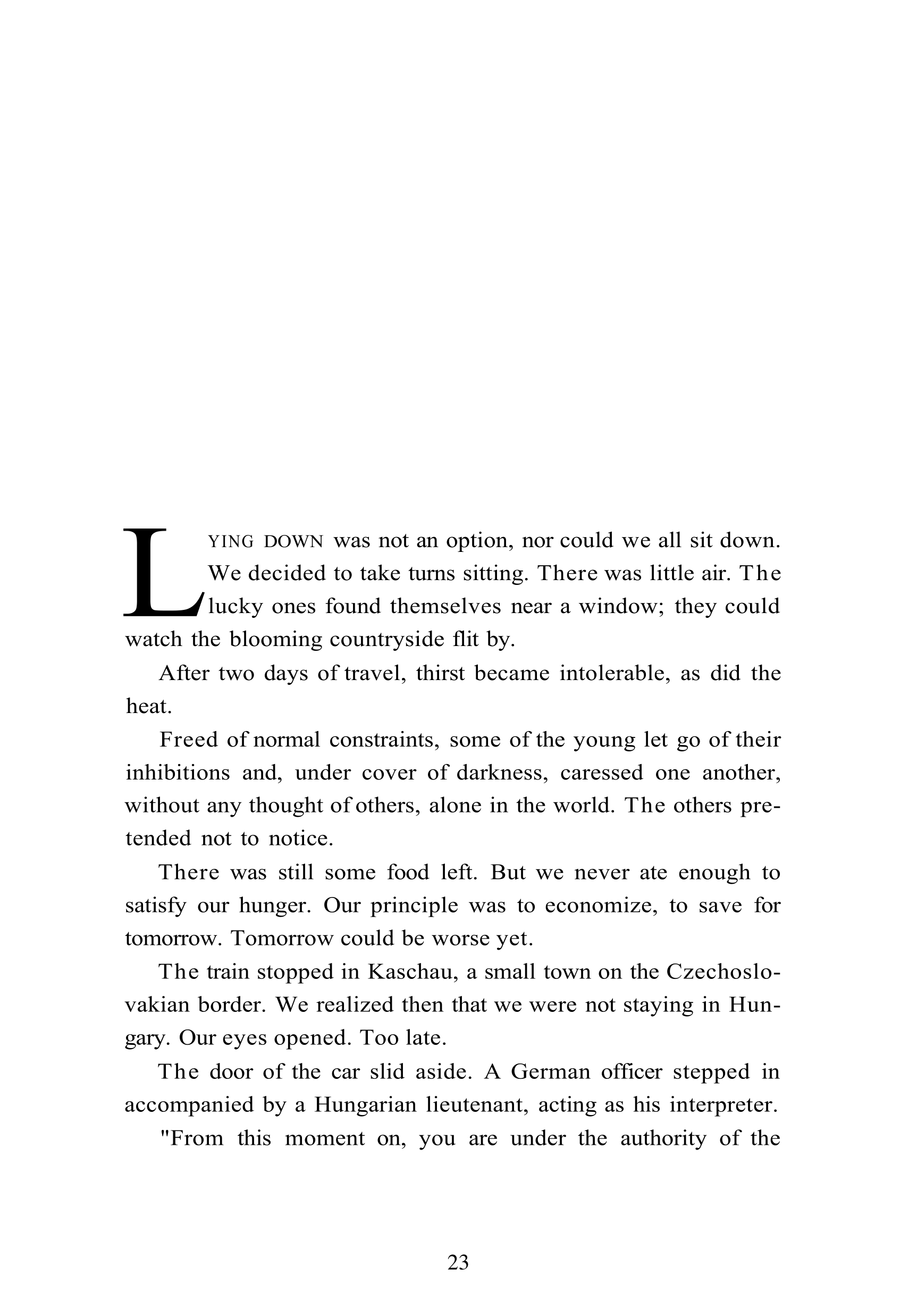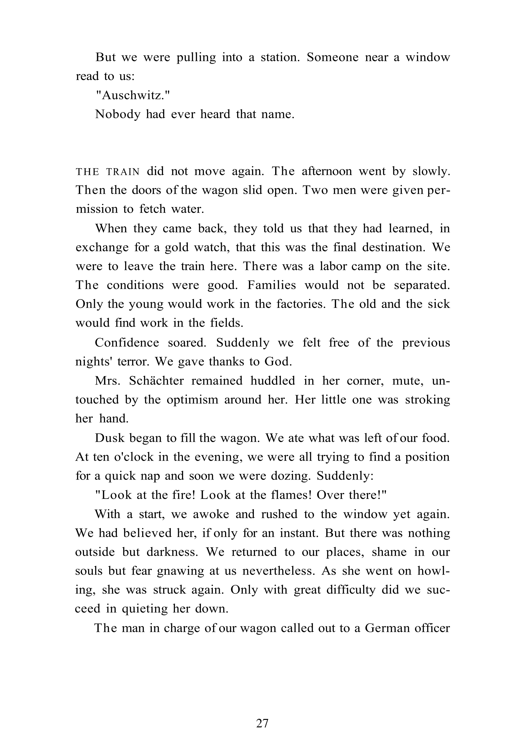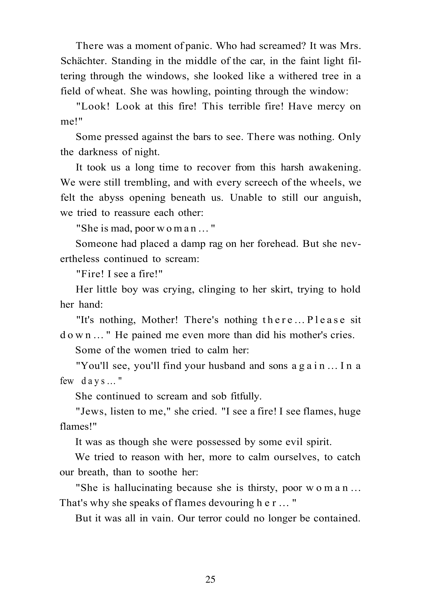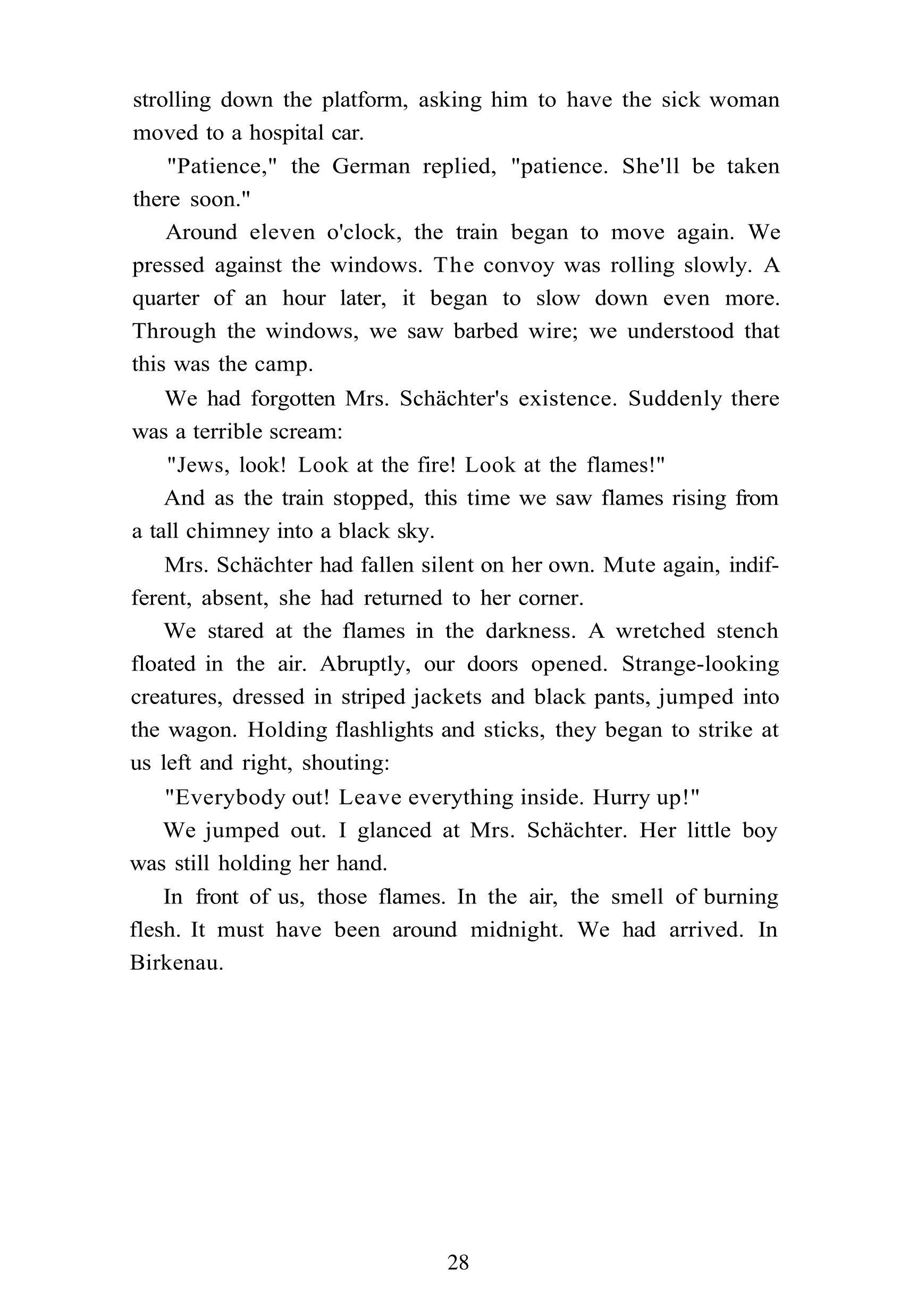 Mrs. Schächter becomes hysterical, and the crowd is forced to restrain her. Her son tries in vain to console his mother; finally, he just clings to her skirt and cries. Eliezer observes, “He pained me even more than did his mother’s cries.” Pretend that you are Eliezer, and you are telling this story to a reporter after the war. Briefly explain to the reporter why you were troubled by the little boy more than by Mrs. Schächter’s hysterics. Also, explain why, in your opinion, Mrs. Schächter was the only person who had a breakdown on the train.