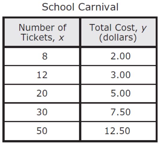 At a school carnival, tickets can be purchased to participate in different activities. The table shows the total cost for different numbers of tickets. What is the constant of proportionality that relates y, the total cost in dollars, to x, the number of tickets purchased?