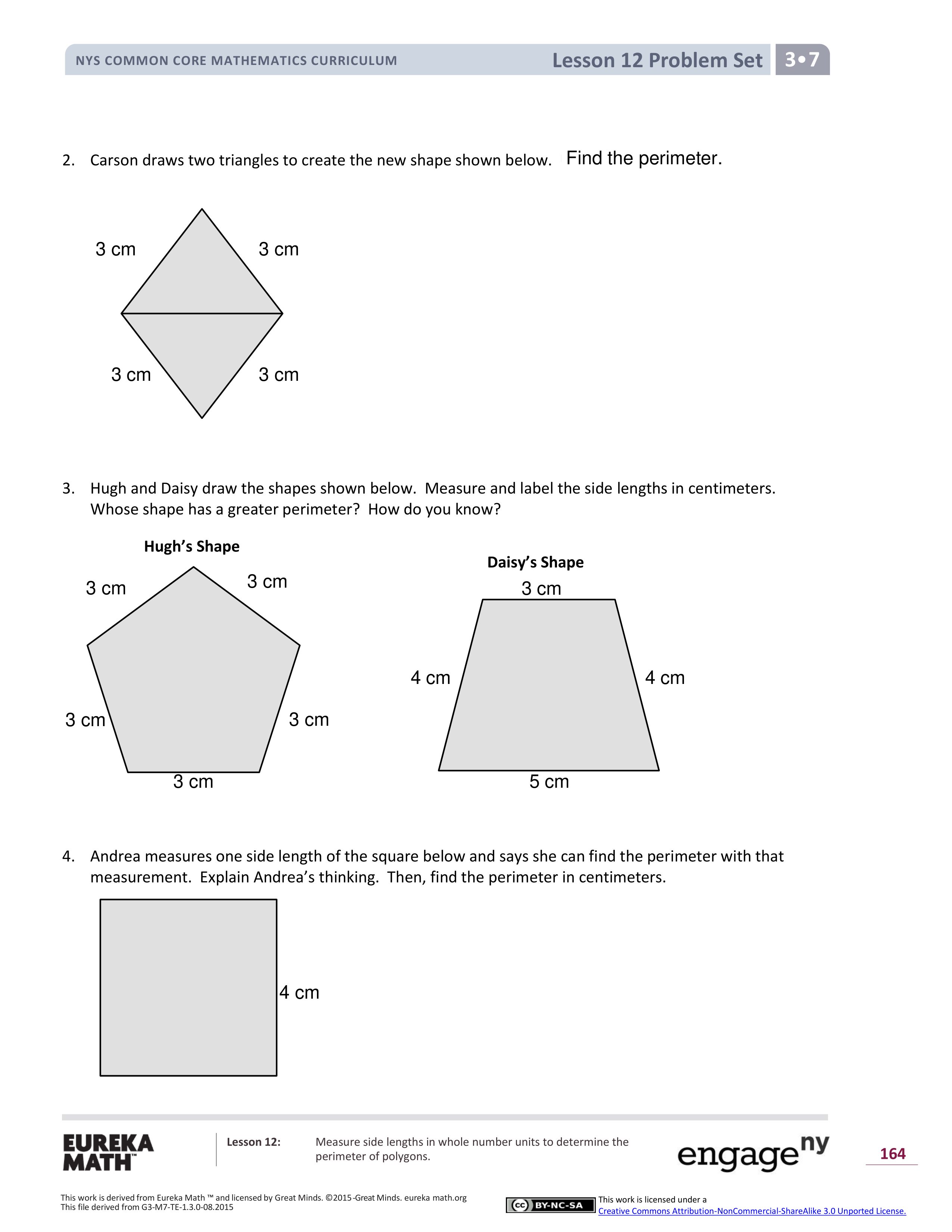 Hugh and Daisy draw he shapes shown below. Measure and label the side lengths in centimeters. Whose shape has a greater perimeter. How do you know?