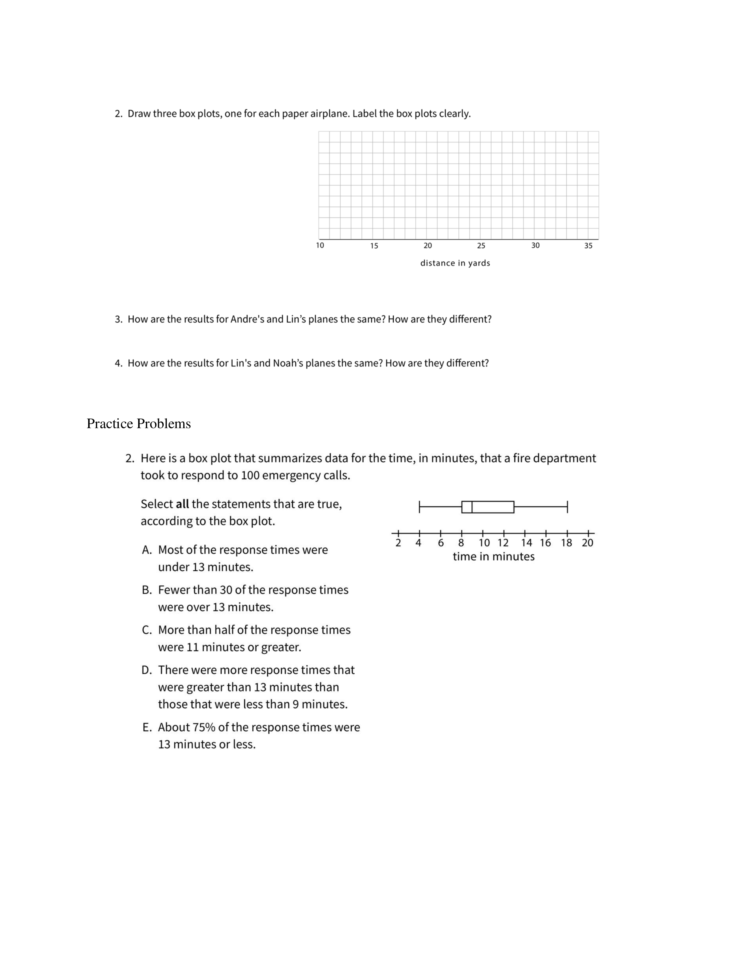 2. Draw three box plots, one for each paper airplane. Label the box plots clearly.