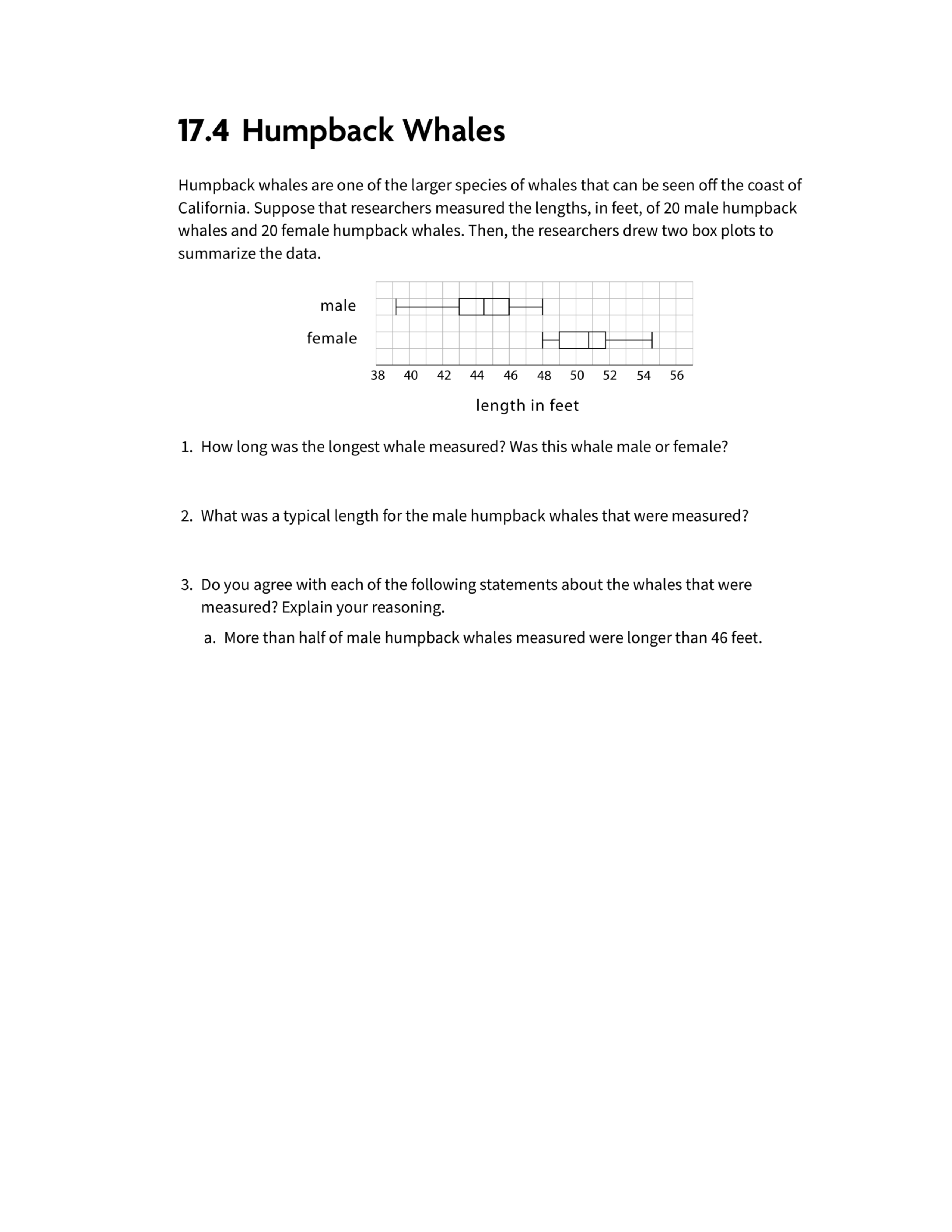 Do you agree with the following statement about the whales that were measured? Explain your reasoning? More than half of male humpback whales measured were longer than 46 feet.