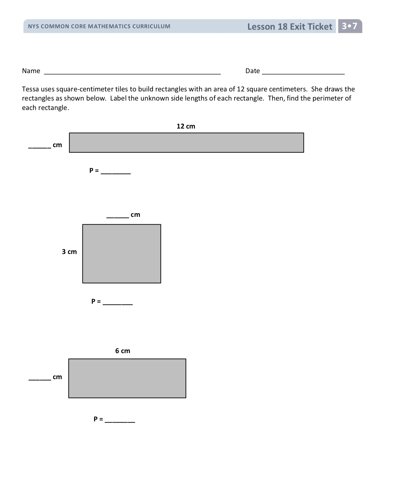 Tessa uses square-centimeter tiles to build rectangles with an area of 12 square centimeters. She draws the rectangles as shown below. Label the UNKNOWN side lengths of each rectangle. Then, find the PERIMETER of each rectangle.