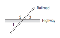 A map shows a railroad crossing a highway, as shown below. Name one pair of angles are supplementary angles.