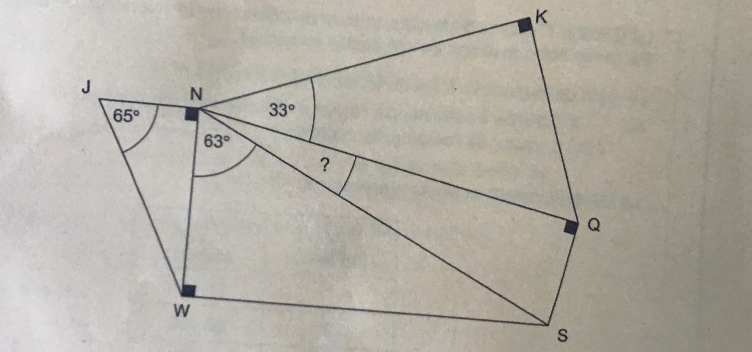 De plus, la mesure du segment KQ est de 450 cm et la mesure du segment JN est de 190cm. Quelle est la mesure de l'angle QNS au degré près?