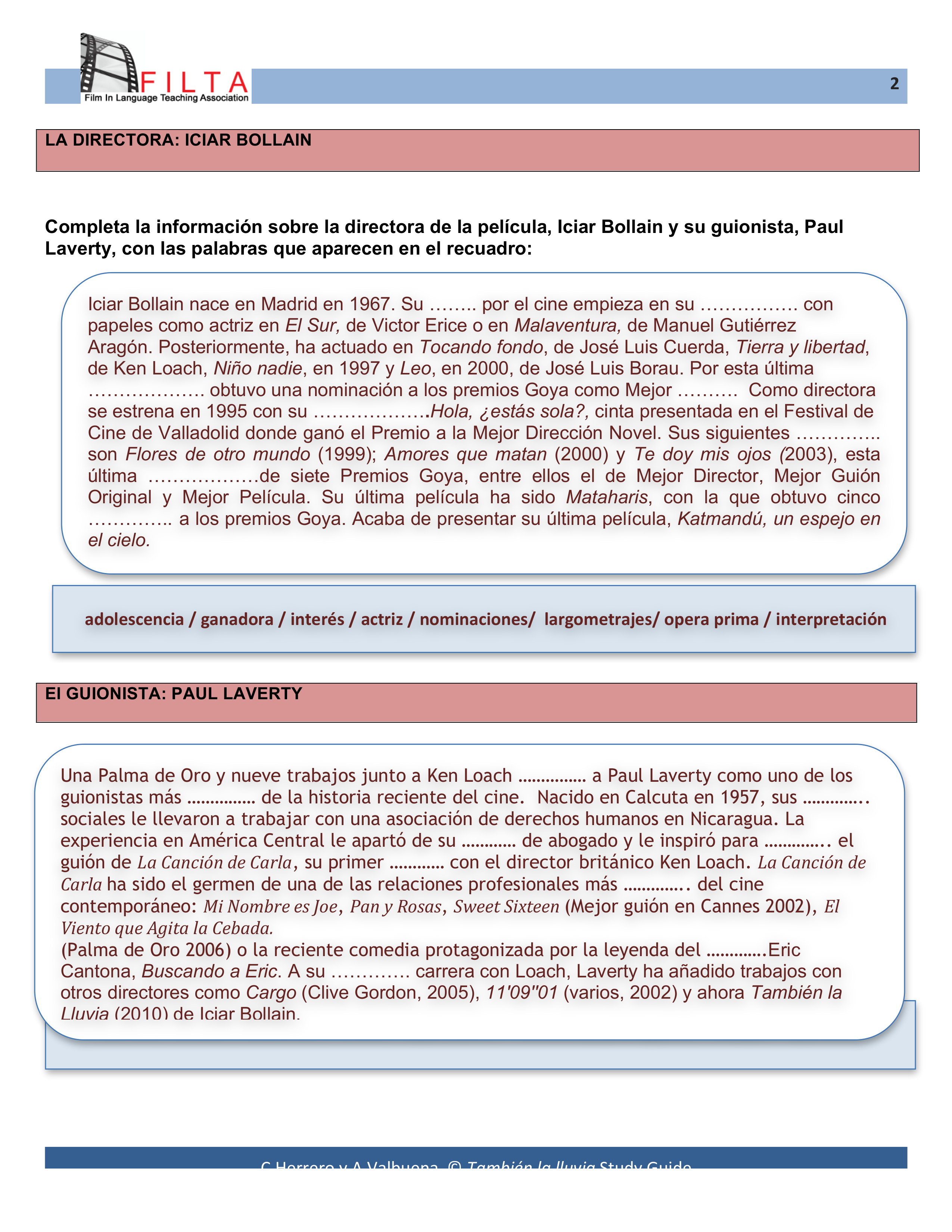 Preguntas extraídas de la Guía didáctica de la película "También la lluvia" por Ana Valbuena et al. La guía se puede encontrar en filta.org.co.uk
