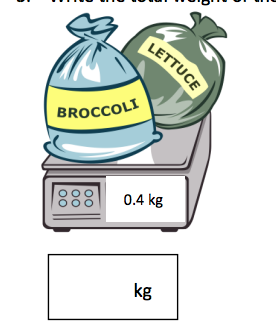 Write the total weight of the food on each scale in fraction form or decimal form.