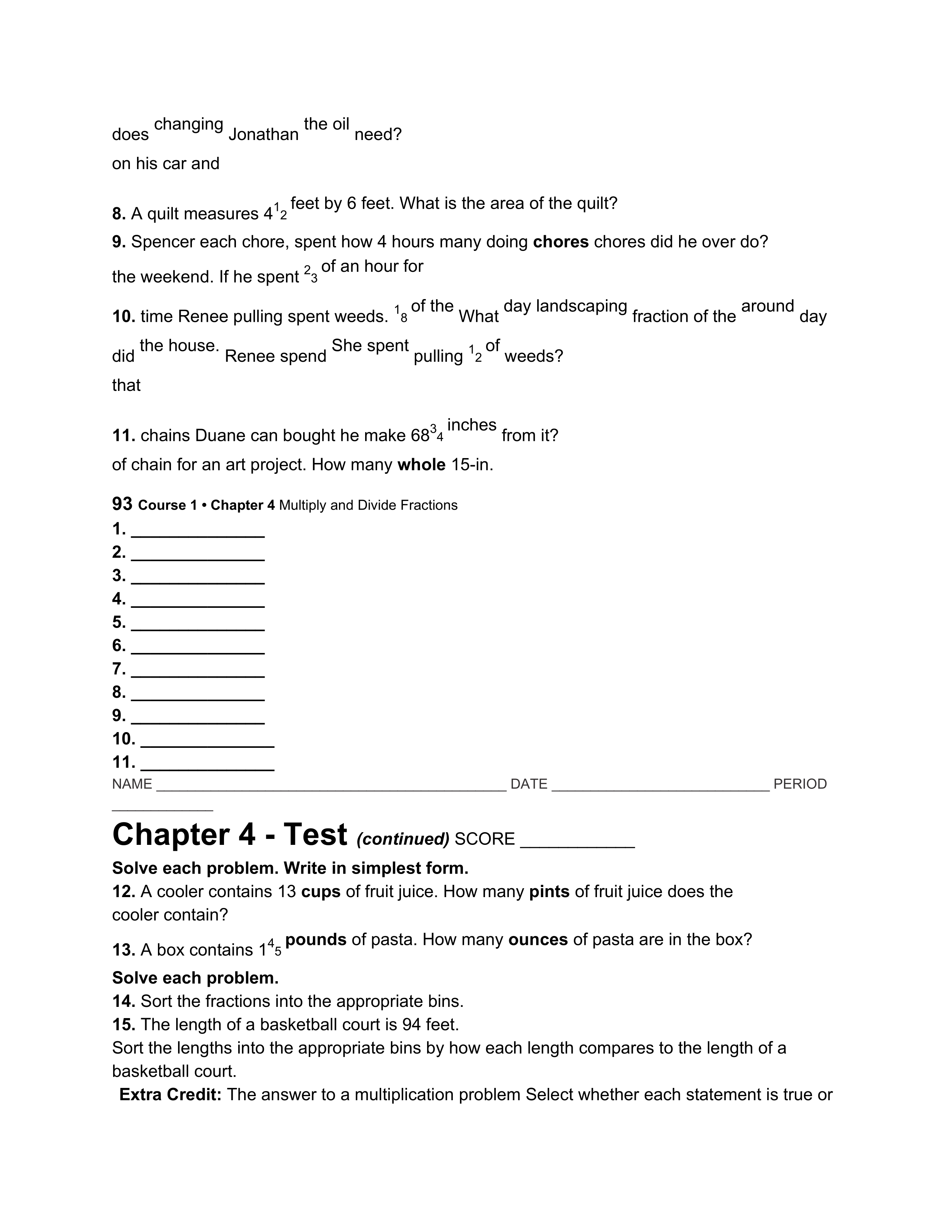 Solve the following problems: Write in simplest form. A quilt measures 4 1/2 feet by 6 feet. What is the area of the quilt? (Area = Length x Width)