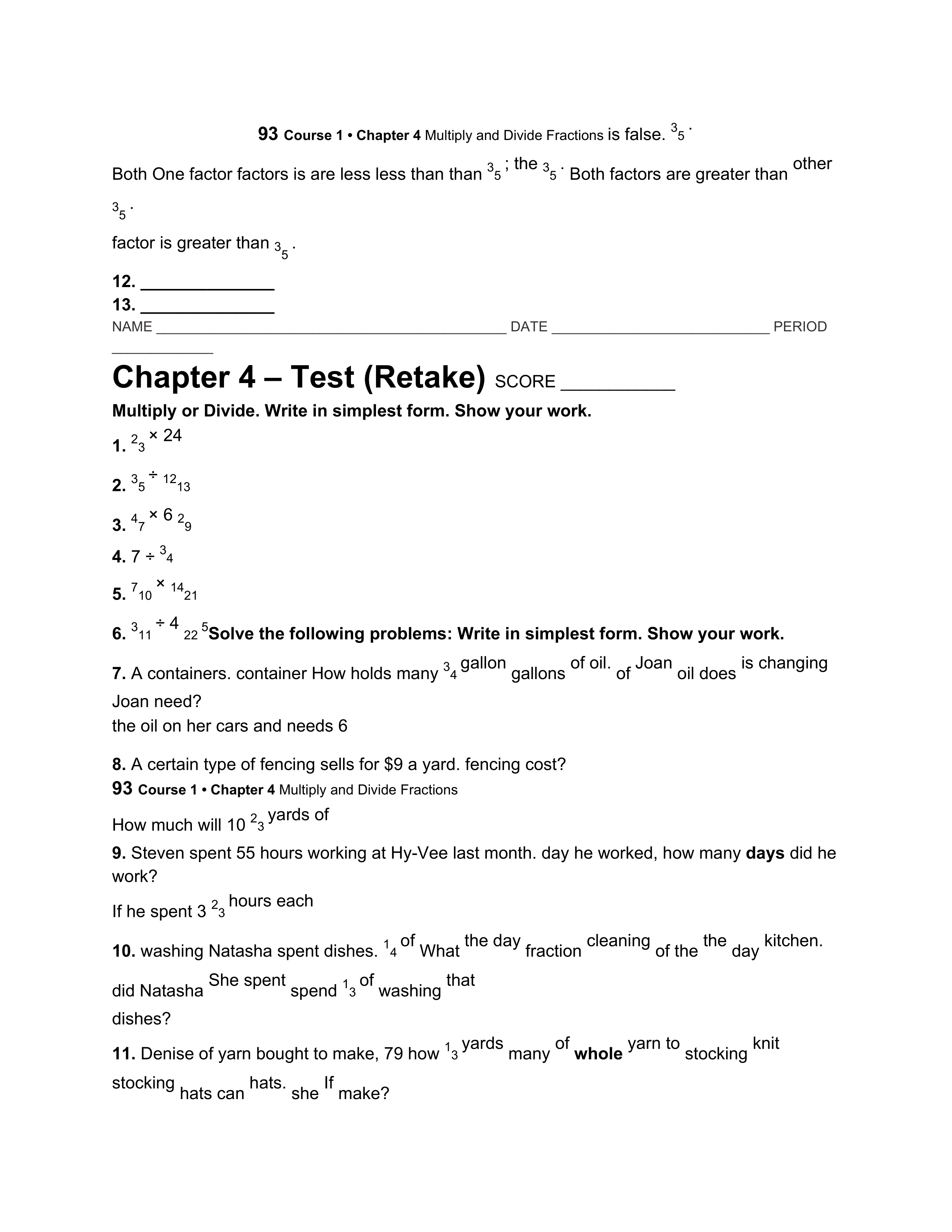 Solve the following problems: Write in simplest form. Spencer spent 4 hours doing chores over the weekend. If he spent 2/3 of an hour for each chore, how many chores did he do?