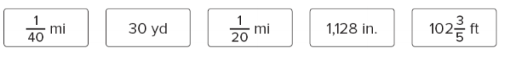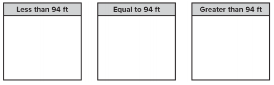 The length of a basketball court is 94 feet. Sort the LENGTHS into the appropriate bins by how each length compares to the length of the basketball court.