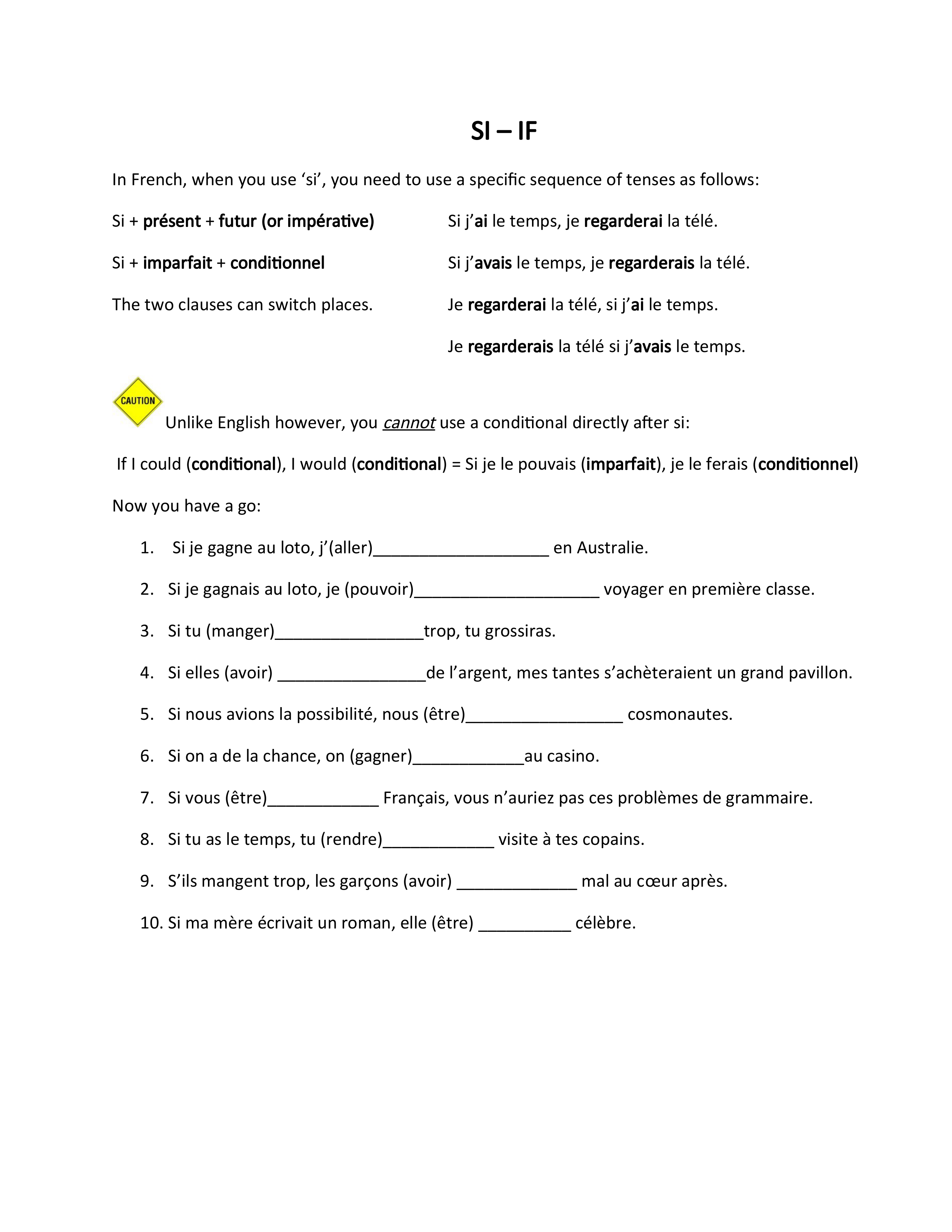 Match the tenses which must be used in Si clauses. (One part in the Si clause, the other in the main/result clause)