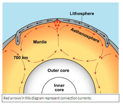 Convection is the process by which hot material rises and cooler material sinks. The molten material of the mantle found deep within Earth heats up and begins to rise toward the crust. As the material gets closer to the crust, it cools down in the asthenosphere, the uppermost layer of the mantle. As it cools, it sinks back toward the core. Eventually, the sinking material heats up and rises again. This produces circular movements called convection currents. Tectonic plates float on top of the asthenosphere as it flows. The asthenosphere is a part of the mantle that is not in the liquid state. The asthenosphere is solid, but it has plasticity. Plasticity is the condition of a solid that allows it to flow like plastic putty.