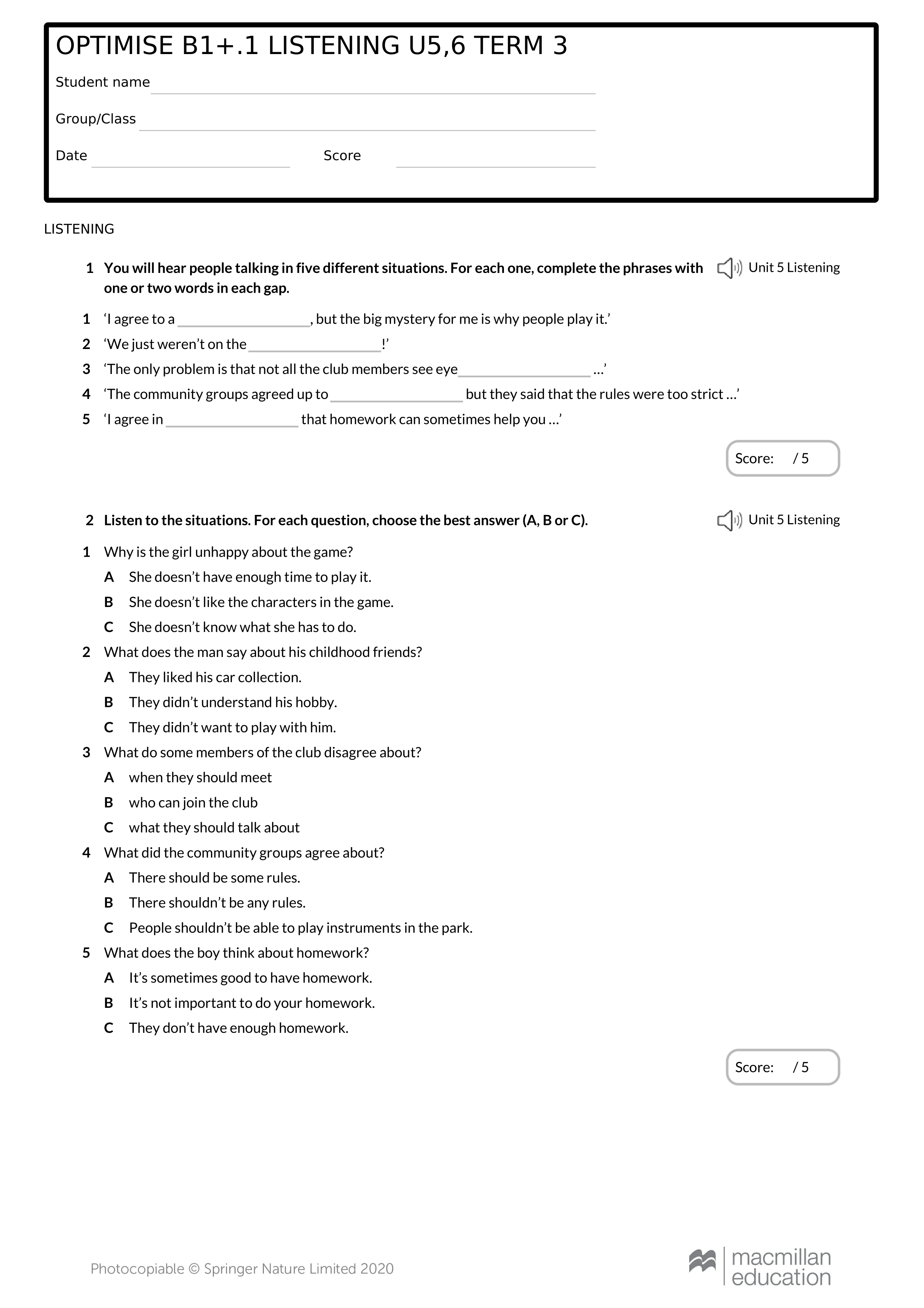 OPTIMISE B1+.1 LISTENING U5,6 TERM 3