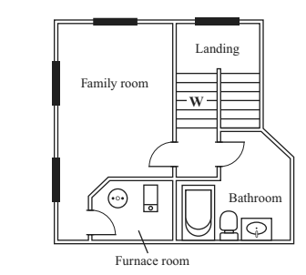 The left side shows a family room that is connected to the furnace room. On the right side of the family room, a doorway leads to a hallway which connects to a bathroom and an area labeled W.