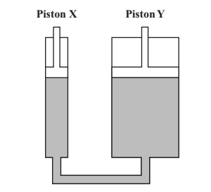 The diagram below shows a system of hydraulic pistons. The surface area of piston Y is nine times greater than the surface area of piston X.
