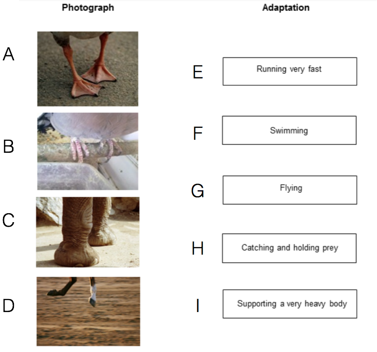 An animal’s feet are adapted to the animal’s way of life. The photographs show the feet of four different animals. Write the two letters for each combination of the photograph of feet with the correct adaptation. You can separate each combination of letters with a semicolumn. [level1-2]