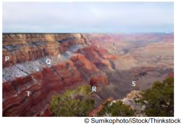 Scientists found five fossils of different species of animal P, Q, R, S and T, at the positions shown.