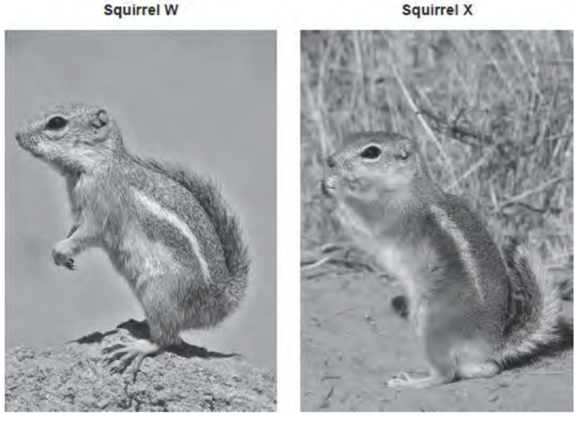 Squirrel W lives on the high ground to the south of the Grand Canyon. Squirrel X lives on the high ground to the north of the Grand Canyon. The land to the north of the Grand Canyon is about 300 metres higher than the land on the south side. The north side also has lower winter temperatures and has more rain and snow than the south side.