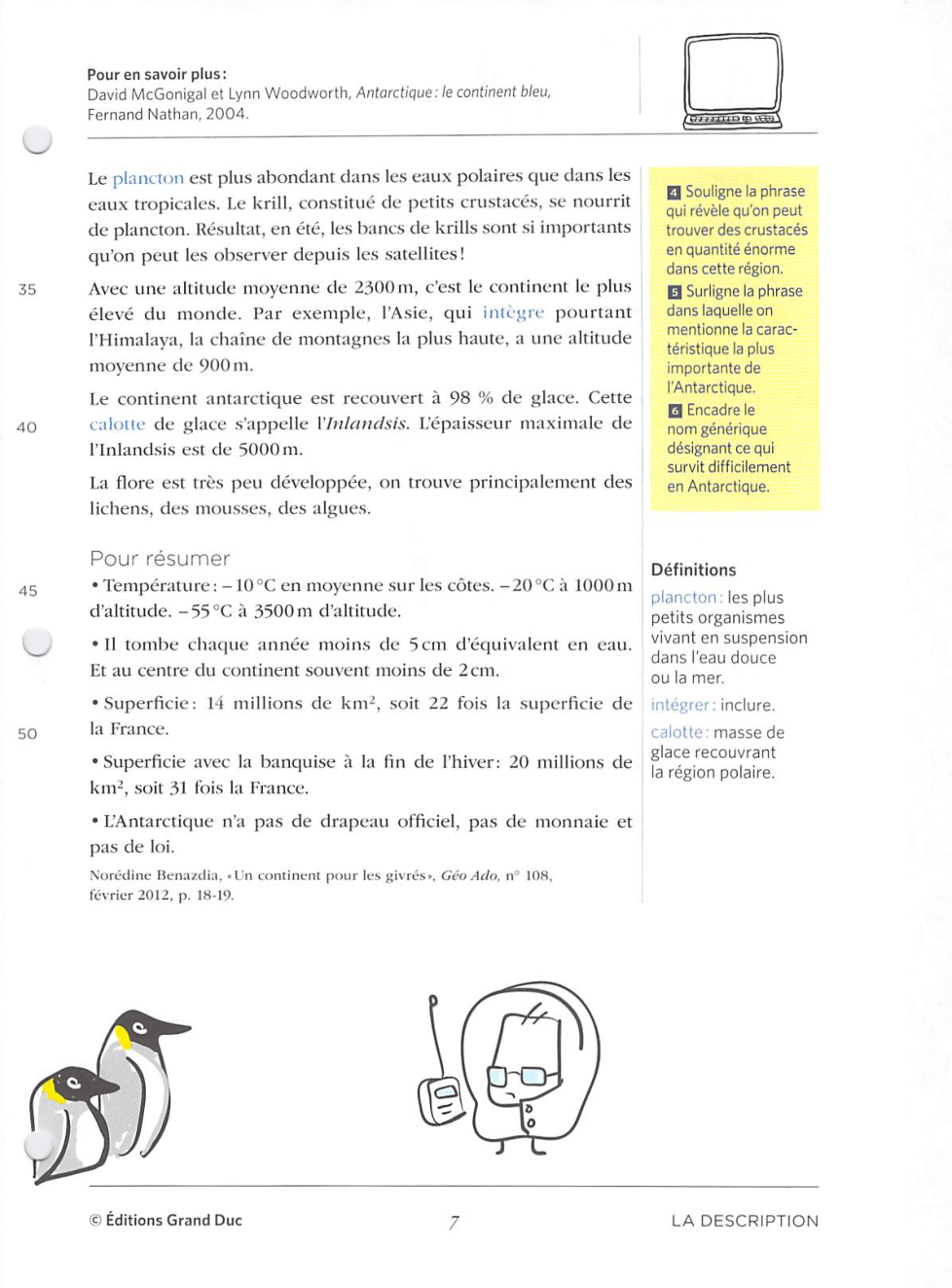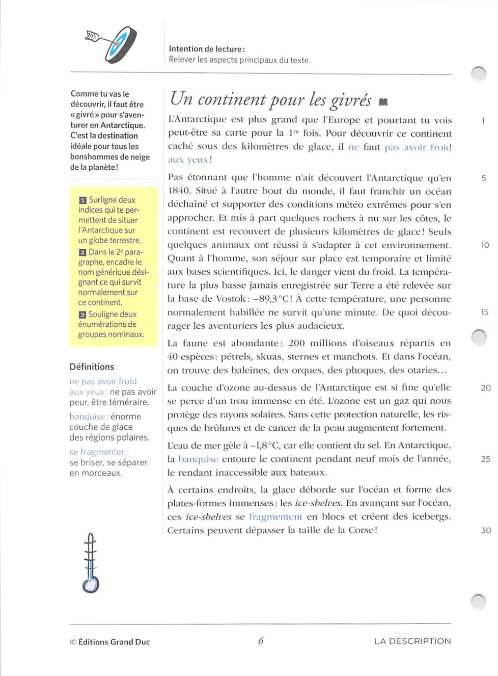 Dans cette partie de texte, relève quatre mots pouvant être associés au thèmedu climat. Pas étonnant que l’homme n’ait découvert l’Antarctique qu’en 1840. Situé à l’autre bout du monde, il faut franchir un océan déchaîné et supporter des conditions météo extrêmes pour s’en approcher. Et mis à part quelques rochers à nu sur les côtes, le continent est recouvert de plusieurs kilomètres de glace! Seuls quelques animaux ont réussi à s’adapter à cet environnement. Quant à l’homme, son séjour sur place est temporaire et limité aux bases scientifiques. Ici, le danger vient du froid. La température la plus basse jamais enregistrée sur Terre a été relevée sur la base de Vostok: –89,3 °C! À cette température, une personne normalement habillée ne survit qu’une minute. De quoi décourager les aventuriers les plus audacieux.