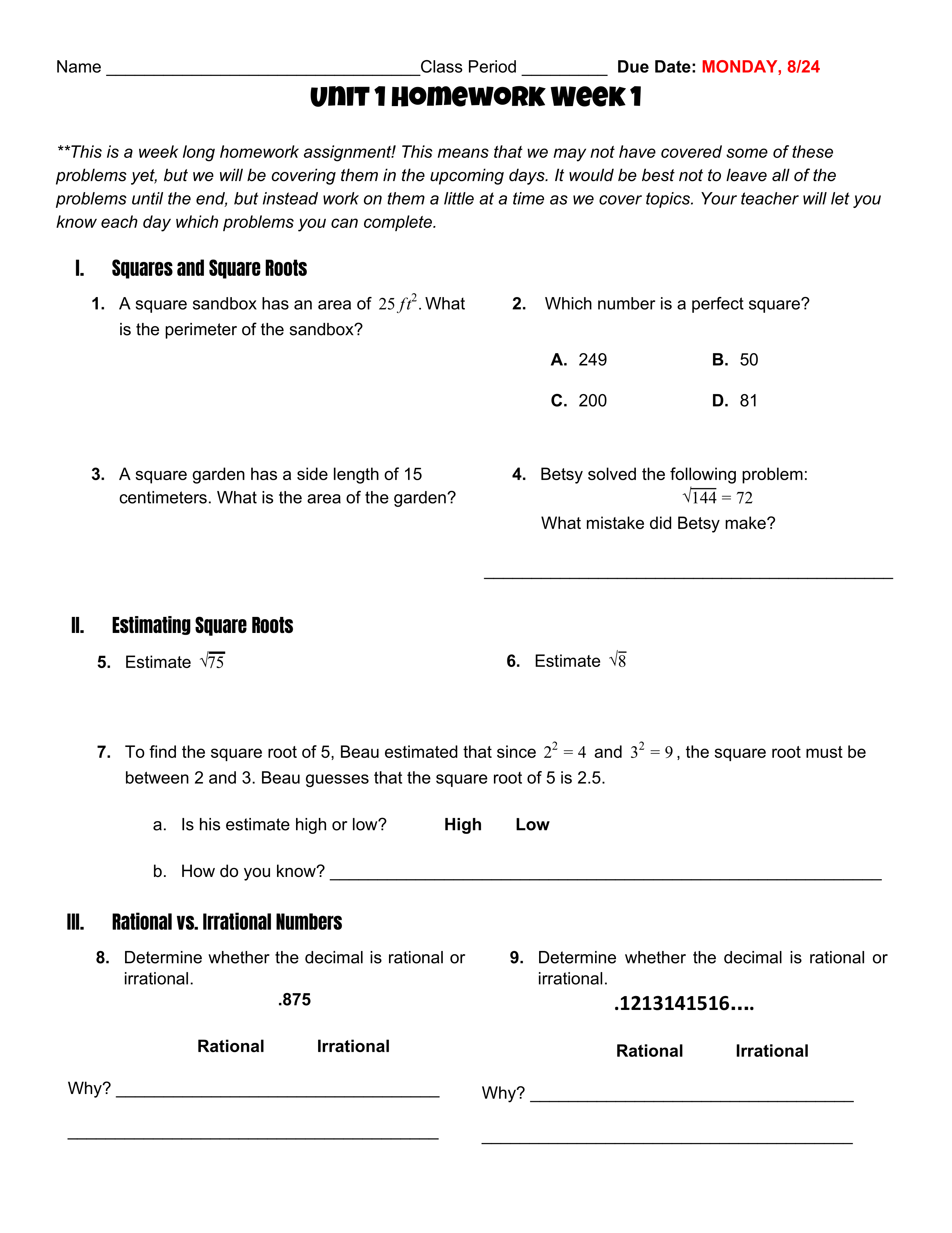 7. To find the square root of 5, Beau estimated that since 22=4 and 32=9, the square root must be between 2 and 3. Beau guesses that the square root of 5 is 2.5.