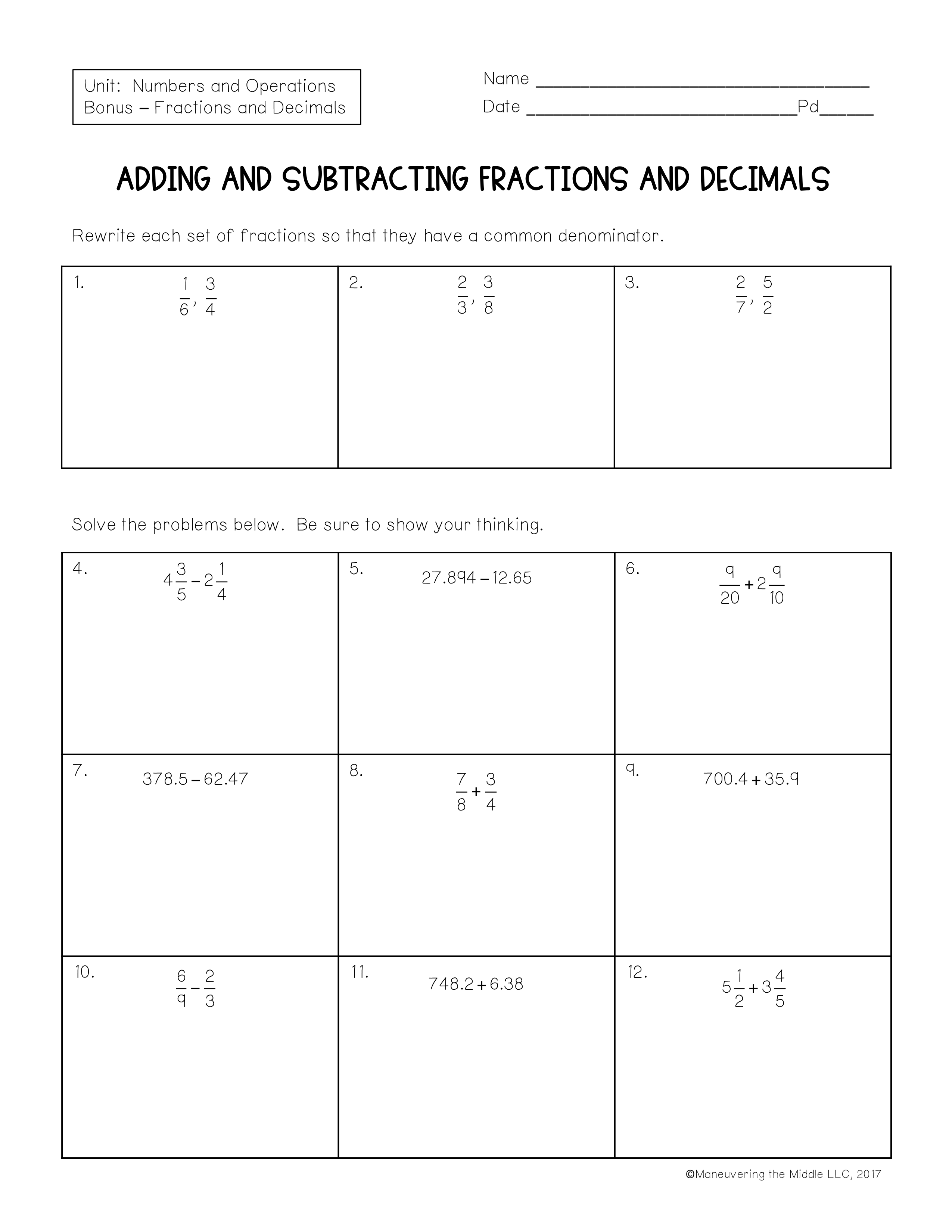 Adding and Subtracting Fractions and Decimals Bonus U1