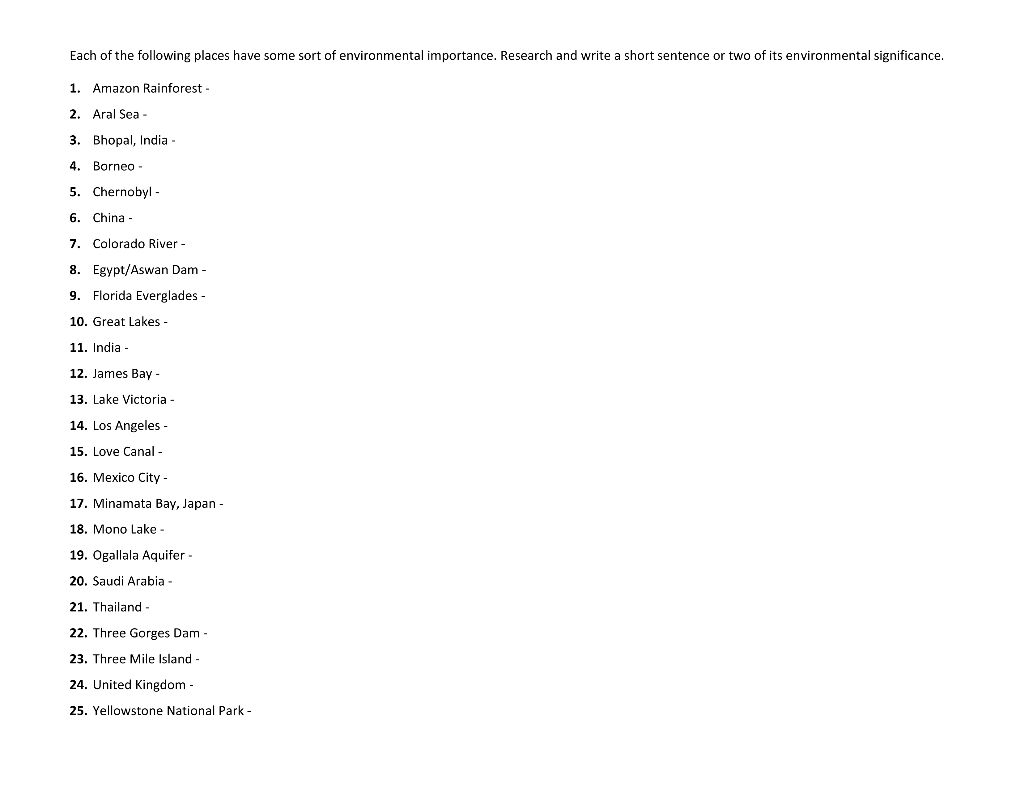 Pick 10 of the places and write their number on the map. All of these places have some sort of environmental importance.
